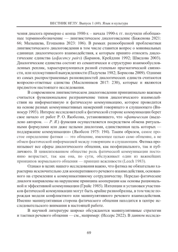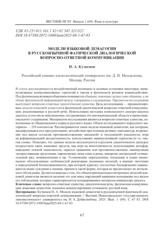 В статье рассматриваются воздейственный потенциал и целевые установки некоторых манипулятивных коммуникативных стратегий и тактик в фатическом речевом взаимодействии. Под фатическим речевым общением понимается общение, имеющее целью само общение, а не обмен фактической информацией между говорящим и слушающим. Предметом исследования выступают вопросно-ответные диалогические единства. Цель исследования – проанализировать модели языковой демагогии в фатической диалогической вопросно-ответной коммуникации, реализованные в русской речи. Использована методика комплексного дискурс-анализа диалога, в том числе имплицитных составляющих его интенциональной области и пропозиционального содержания. Материалом исследования являются вопросно-ответные единства, извлеченные из Национального корпуса русского языка. Объем исследованного корпусного материала - 218 контекстов. Рассматриваются такие модели языковой демагогии, как ассерция, маскирующаяся под пресуппозицию, воздействие при помощи речевых импликатур, возражение под видом согласия, противопоставление «видимой» и «подлинной» реальности, игра на референциальной неоднозначности, использование манипулятивной стратегии de re, «магия слова». Показано, что данные модели актуализуются в русском диалогическом дискурсе посредством таких языковых средств, как игра на многозначности, использование метафор, наведение ложной оценочности, скрытое сравнение или противопоставление, манипуляция экспрессивными средствами, парономазия, мена темы и ремы, инверсия, аномальный сочинительный ряд, номинализация и пр. Установлены определенные тенденции в плане национально обусловленных особенностей реализации указанных моделей, а именно тяготение к определенной безапеляционности, при которой адресату достаточно бесцеремонно навязываются некие суждения и мнения, причем в такой форме, которая не предполагает их возможного обсуждения. Делаются выводы о том, что общим признаком рассмотренных моделей языковой демагогии является наличие тех или иных нарушений принципа кооперации под видом его соблюдения, которые характеризуются игнорированием интересов инициатора диалога.