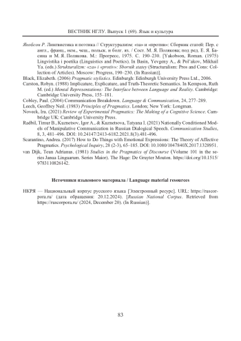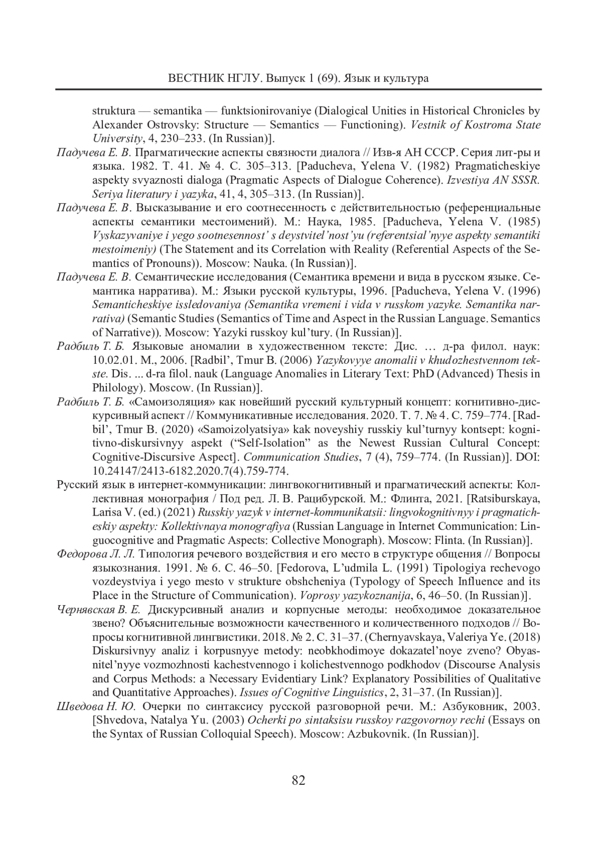 18. Русский язык в интернет-коммуникации: лингвокогнитивный и прагматический аспекты: Коллективная монография / Под ред. Л. В. Рацибурской. М.: Флинта, 2021. [Ratsiburskaya, Larisa V. (ed.) (2021) Russkiy yazyk v internet-kommunikatsii: lingvokognitivnyy i pragmaticheskiy aspekty: Kollektivnaya monografiya (Russian Language in Internet Communication: Linguocognitive and Pragmatic Aspects: Collective Monograph). Moscow: Flinta. (In Russian)].