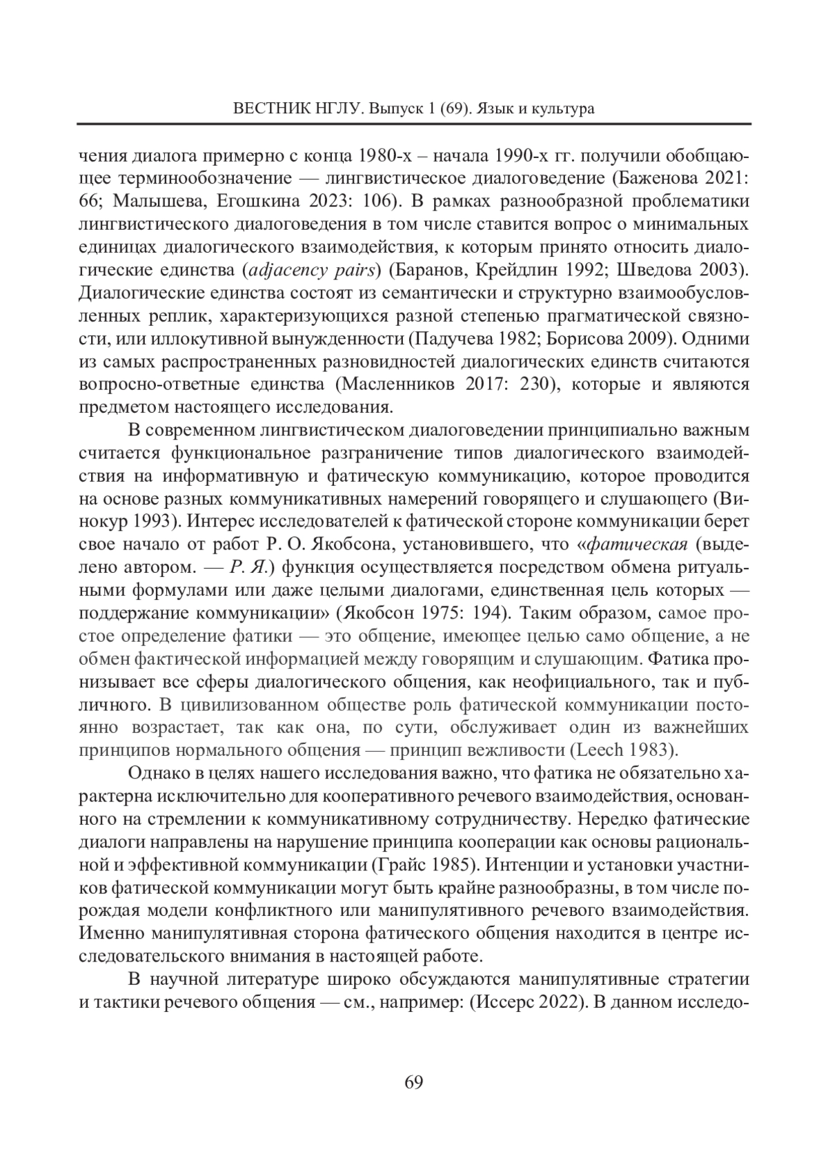 6. Винокур Т. Г. Информативная и фатическая речь как обнаружение разных коммуникативных намерений говорящего и слушающего // Русский язык в его функционировании. Коммуникативно-прагматический аспект / Под ред. Е. А. Земской, Д. Н. Шмелева; Российская акад. наук, Ин-т русского языка им. В. В. Виноградова. М.: Наука, 1993. С. 5-29. [Vinokur, Tatyana G. (1993) Informativnaya i faticheskaya rech’ kak obnaruzheniye raznykh kommunikativnykh namereniy govoryashchego i slushayushchego (Informative and Phatic Speech as the Detection of Different Communicative Intentions of the Speaker and Listener). In Zemskaya, Elena A., Shmelev, Dmitry N. (eds.) Russkiy yazyk v yego funktsionirovanii. Kommunikativno-pragmaticheskiy aspekt (Russian Language in its Functioning. Communicative-Pragmatic Aspect). Moscow: Nauka, 5-29. (In Russian)].