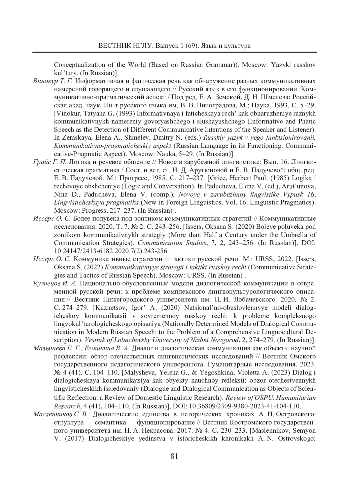 11. Малышева Е. Г., Егошкина В. А. Диалог и диалогическая коммуникация как объекты научной рефлексии: обзор отечественных лингвистических исследований // Вестник Омского государственного педагогического университета. Гуманитарные исследования. 2023. № 4 (41). С. 104-110. [Malysheva, Yelena G., & Yegoshkina, Violetta A. (2023) Dialog i dialogicheskaya kommunikatsiya kak obyekty nauchnoy refleksii: obzor otechestvennykh lingvisticheskikh issledovaniy (Dialogue and Dialogical Communication as Objects of Scientific Reflection: a Review of Domestic Linguistic Research). Review of OSPU. Humanitarian Research, 4 (41), 104-110. (In Russian)]. DOI: 10.36809/2309-9380-2023-41-104-110 EDN: QZPRNI