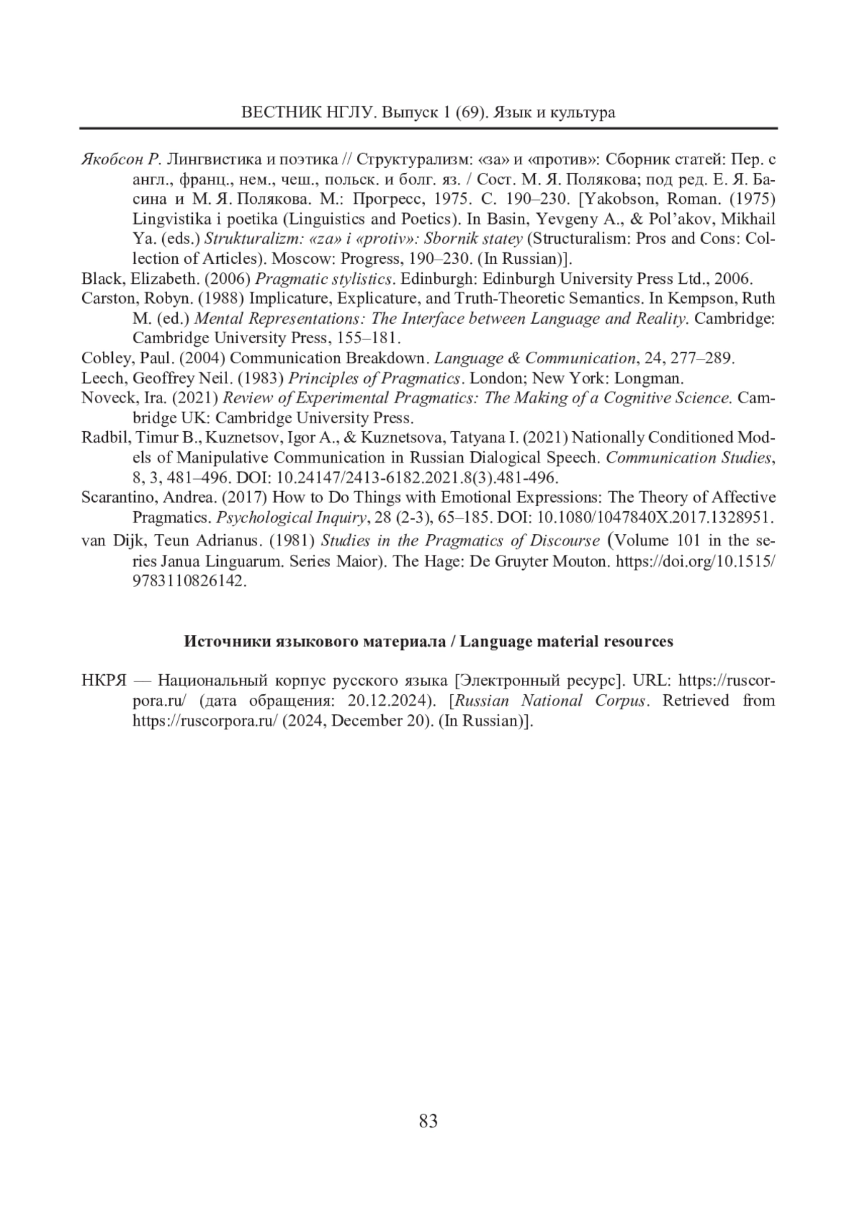 22. Якобсон Р. Лингвистика и поэтика // Структурализм: “за” и “против”: Сборник статей: Пер. с англ., франц., нем., чеш., польск. и болг. яз. / Сост. М. Я. Полякова; под ред. Е. Я. Басина и М. Я. Полякова. М.: Прогресс, 1975. С. 190-230. [Yakobson, Roman. (1975) Lingvistika i poetika (Linguistics and Poetics). In Basin, Yevgeny A., & Pol’akov, Mikhail Ya. (eds.) Strukturalizm: “za” i “protiv”: Sbornik statey (Structuralism: Pros and Cons: Collection of Articles). Moscow: Progress, 190-230. (In Russian)].