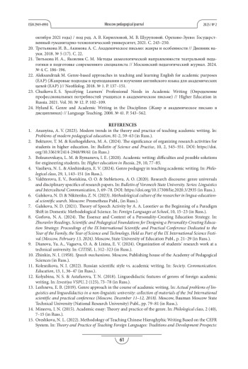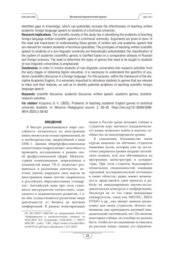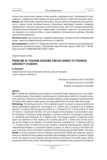 КНЯЗЕВА О. В. ПРОБЛЕМЫ ОБУЧЕНИЯ СТУДЕНТОВ ТЕХНИЧЕСКОГО ВУЗА ЖАНРАМ АКАДЕМИЧЕСКОГО АНГЛИЙСКОГО ЯЗЫКА // МОСКОВСКИЙ ПЕДАГОГИЧЕСКИЙ ЖУРНАЛ. 2025. № 2