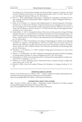 Выводы. Для вовлечения студентов неязыковых вузов в научно-исследовательскую деятельность с ранних этапов получения высшего образования необходимо понимать специфику академического (научного) дискурса на иностранном языке. Для этого в рамках дисциплины «Академический английский язык» крайне важно познакомить студентов с актуальными для них жанрами и их особенностями, а также определить потенциальные проблемы обучения научной иноязычной речи.