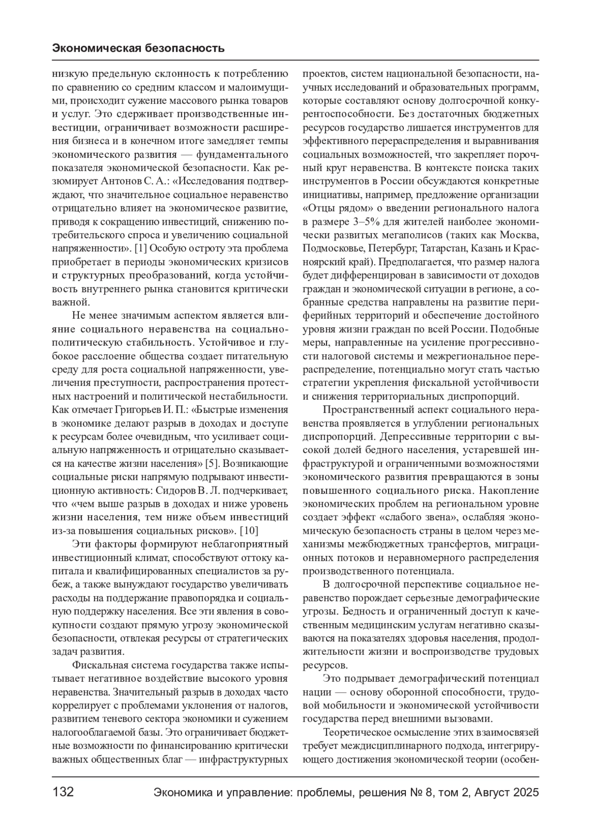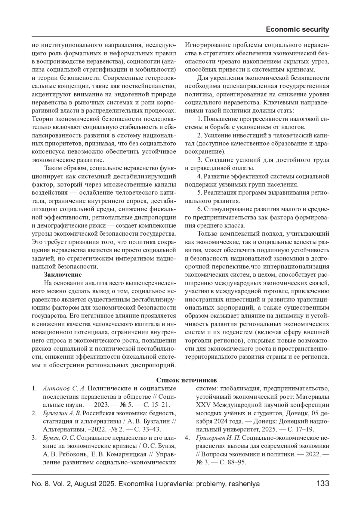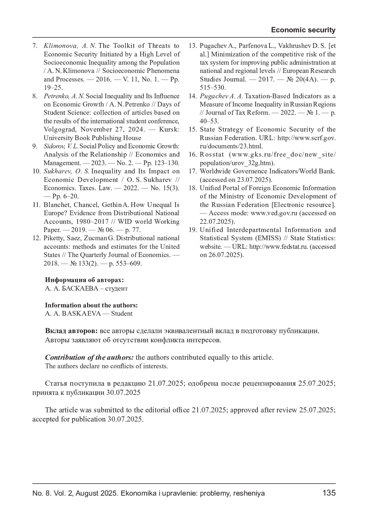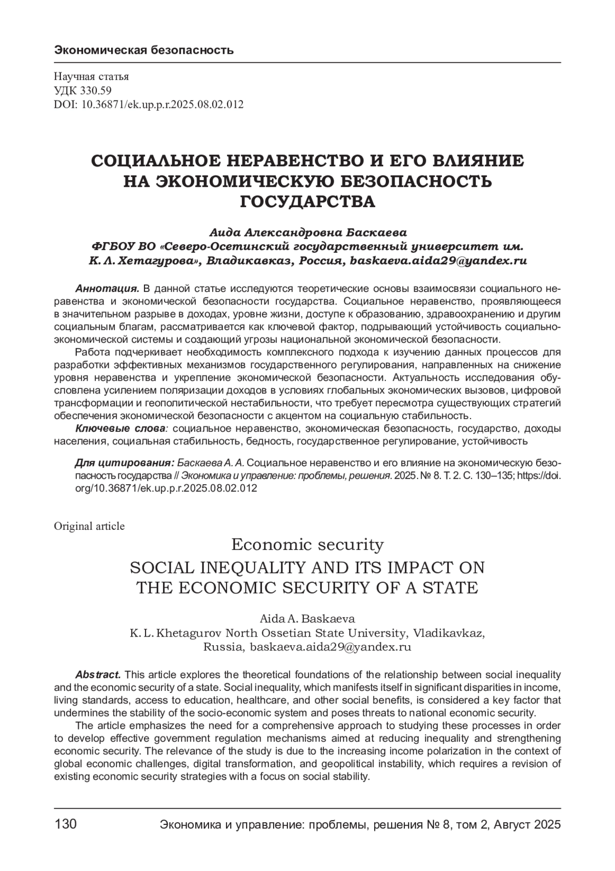 БАСКАЕВА А. А. СОЦИАЛЬНОЕ НЕРАВЕНСТВО И ЕГО ВЛИЯНИЕ НА ЭКОНОМИЧЕСКУЮ БЕЗОПАСНОСТЬ ГОСУДАРСТВА // ЭКОНОМИКА И УПРАВЛЕНИЕ: ПРОБЛЕМЫ, РЕШЕНИЯ. 2025. ТОМ 2 № 8