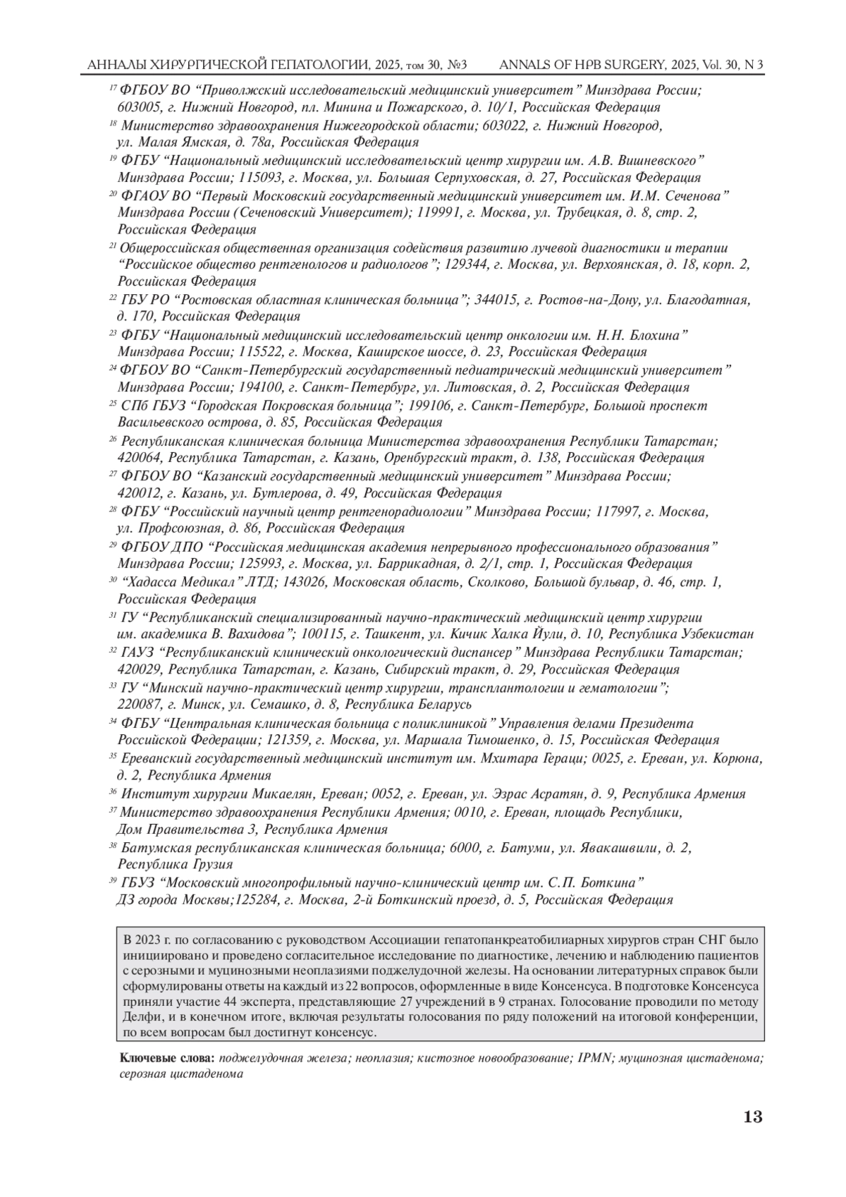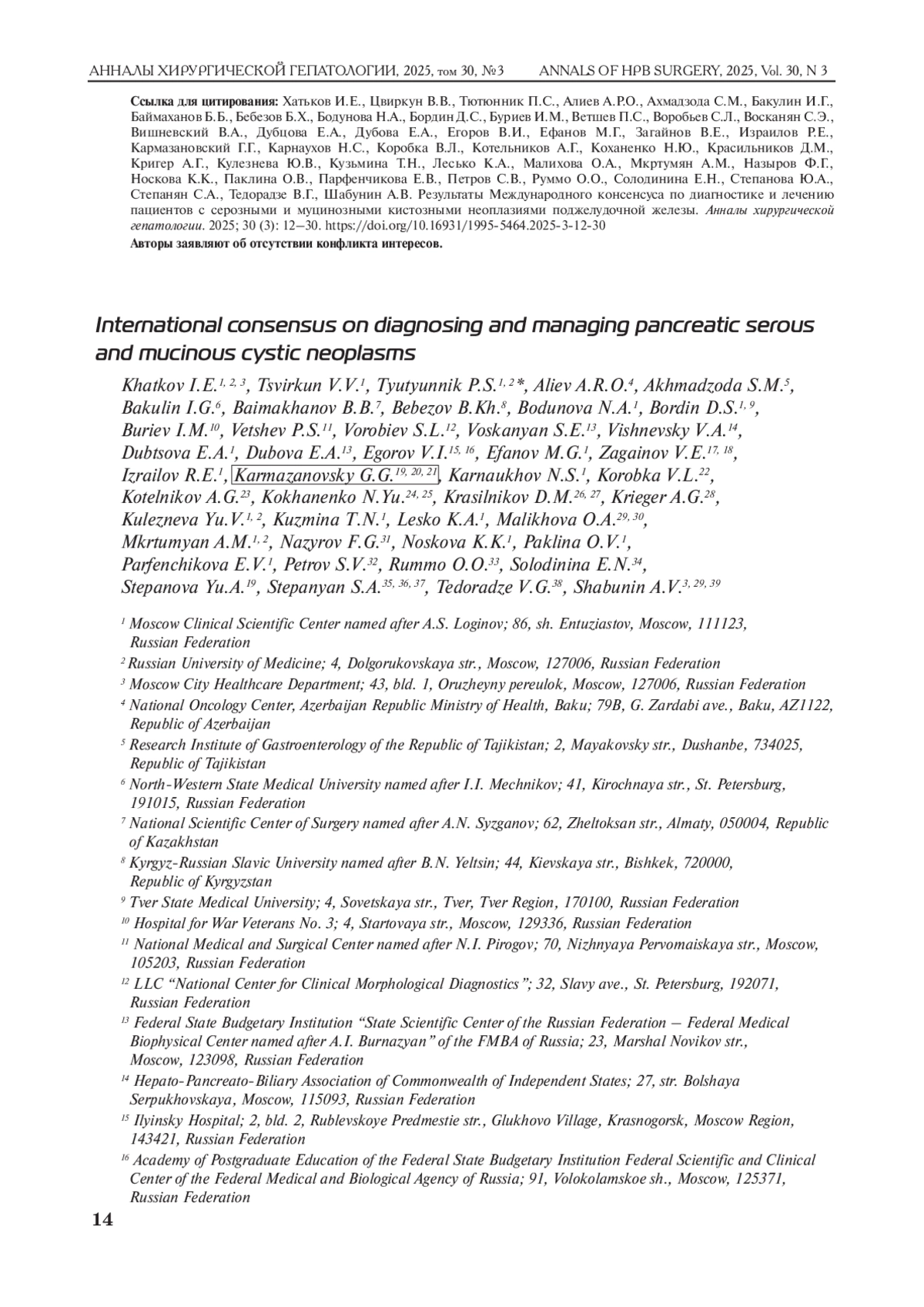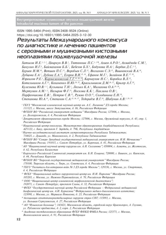 ХАТЬКОВ И. Е., ЦВИРКУН В. В., ТЮТЮННИК П. С., АЛИЕВ А. Р., АХМАДЗОДА С. М., БАКУЛИН И. Г., БАЙМАХАНОВ Б. Б., БЕБЕЗОВ Б. Х., БОДУНОВА Н. А., БОРДИН Д. С., БУРИЕВ И. М., ВЕТШЕВ П. С., ВОРОБЬЕВ С. Л., ВОСКАНЯН С. Э., ВИШНЕВСКИЙ В. А., ДУБЦОВА Е. А., ДУБОВА Е. А., ЕФАНОВ М. Г., ЗАГАЙНОВ В. Е., ИЗРАИЛОВ Р. Е., КАРМАЗАНОВСКИЙ Г. Г., КАРНАУХОВ Н. С., КОРОБКА В. Л., КОТЕЛЬНИКОВ А. Г., КОХАНЕНКО Н. Ю., КРАСИЛЬНИКОВ Д. М., КРИГЕР А. Г., КУЛЕЗНЕВА Ю. В., КУЗЬМИНА Т. Н., ЛЕСЬКО К. А., МАЛИХОВА О. А., МКРТУМЯН М. М., НАЗЫРОВ Ф. Г., НОСКОВА К. К., ПАКЛИНА О. В., ПАРФЕНЧИКОВА Е. В., ПЕТРОВ С. В., РУММО О. О., СОЛОДИНИНА Е. Н., СТЕПАНОВА Ю. А., СТЕПАНЯН С. А., ТЕДОРАДЗЕ В. Г., ШАБУНИН А. В. РЕЗУЛЬТАТЫ МЕЖДУНАРОДНОГО КОНСЕНСУСА ПО ДИАГНОСТИКЕ И ЛЕЧЕНИЮ ПАЦИЕНТОВ С СЕРОЗНЫМИ И МУЦИНОЗНЫМИ КИСТОЗНЫМИ НЕОПЛАЗИЯМИ ПОДЖЕЛУДОЧНОЙ ЖЕЛЕЗЫ // АННАЛЫ ХИРУРГИЧЕСКОЙ ГЕПАТОЛОГИИ. 2025. № 3, ТОМ 30