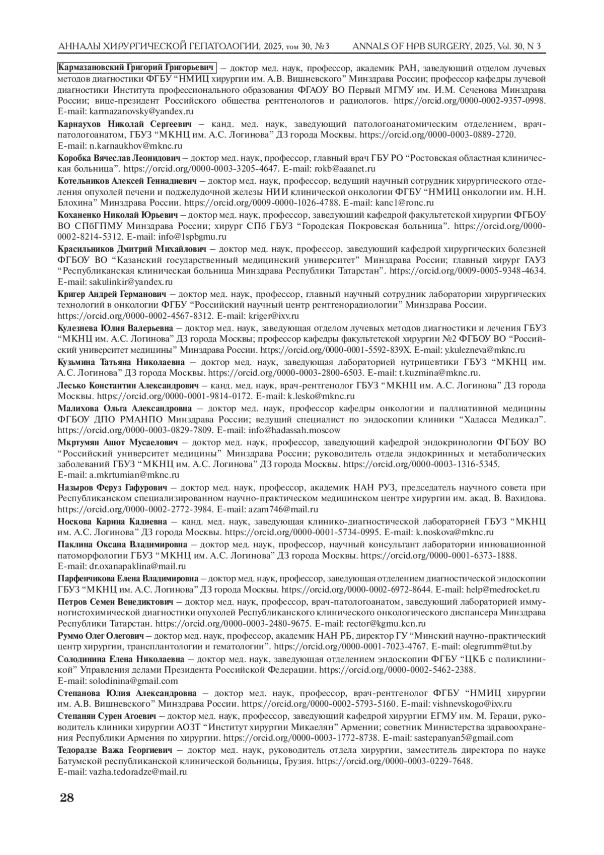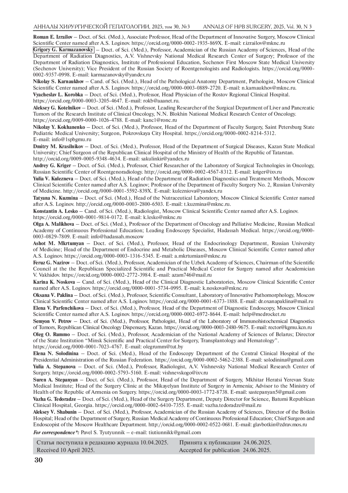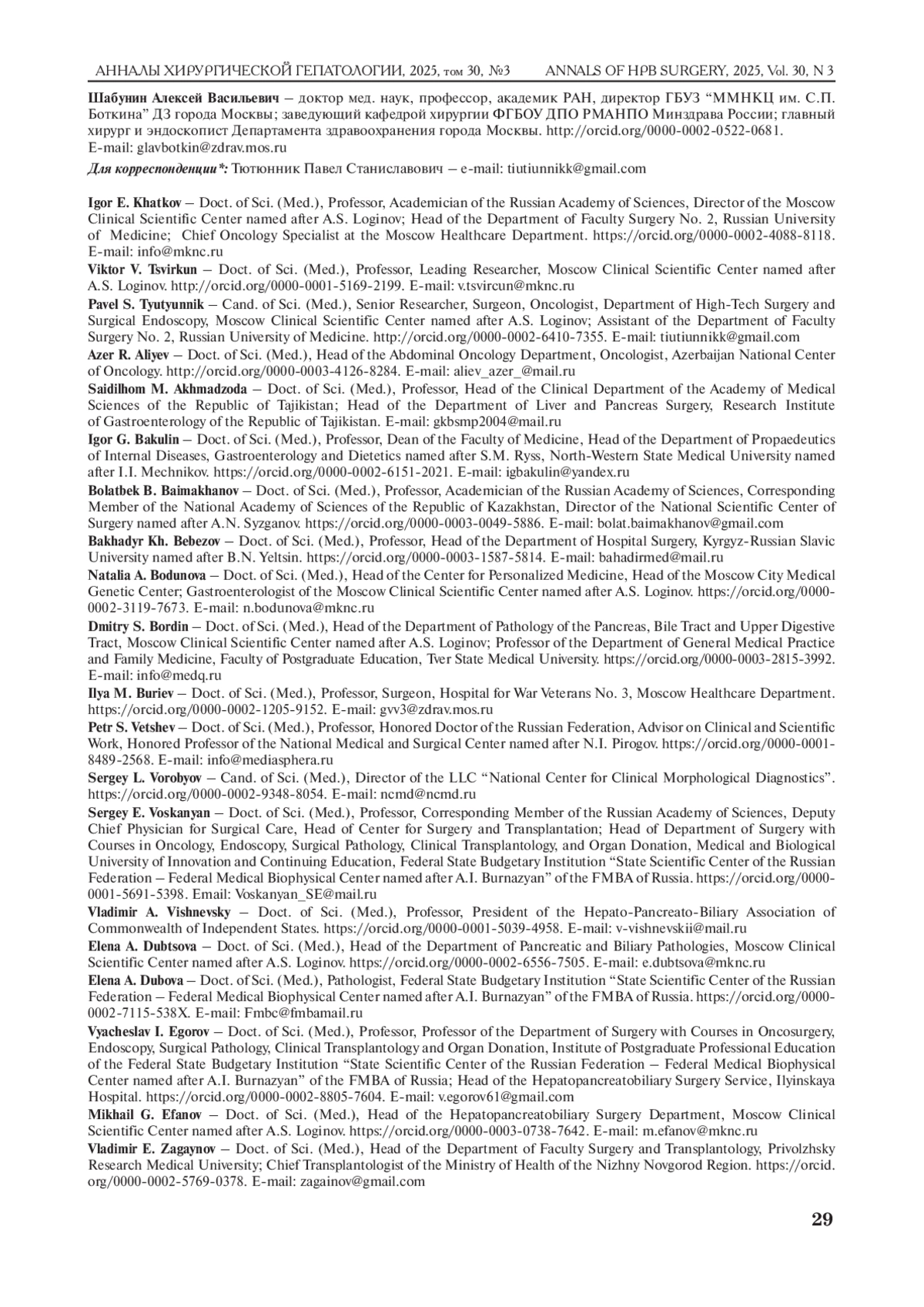 ХАТЬКОВ И. Е., ЦВИРКУН В. В., ТЮТЮННИК П. С., АЛИЕВ А. Р., АХМАДЗОДА С. М., БАКУЛИН И. Г., БАЙМАХАНОВ Б. Б., БЕБЕЗОВ Б. Х., БОДУНОВА Н. А., БОРДИН Д. С., БУРИЕВ И. М., ВЕТШЕВ П. С., ВОРОБЬЕВ С. Л., ВОСКАНЯН С. Э., ВИШНЕВСКИЙ В. А., ДУБЦОВА Е. А., ДУБОВА Е. А., ЕФАНОВ М. Г., ЗАГАЙНОВ В. Е., ИЗРАИЛОВ Р. Е., КАРМАЗАНОВСКИЙ Г. Г., КАРНАУХОВ Н. С., КОРОБКА В. Л., КОТЕЛЬНИКОВ А. Г., КОХАНЕНКО Н. Ю., КРАСИЛЬНИКОВ Д. М., КРИГЕР А. Г., КУЛЕЗНЕВА Ю. В., КУЗЬМИНА Т. Н., ЛЕСЬКО К. А., МАЛИХОВА О. А., МКРТУМЯН М. М., НАЗЫРОВ Ф. Г., НОСКОВА К. К., ПАКЛИНА О. В., ПАРФЕНЧИКОВА Е. В., ПЕТРОВ С. В., РУММО О. О., СОЛОДИНИНА Е. Н., СТЕПАНОВА Ю. А., СТЕПАНЯН С. А., ТЕДОРАДЗЕ В. Г., ШАБУНИН А. В. РЕЗУЛЬТАТЫ МЕЖДУНАРОДНОГО КОНСЕНСУСА ПО ДИАГНОСТИКЕ И ЛЕЧЕНИЮ ПАЦИЕНТОВ С СЕРОЗНЫМИ И МУЦИНОЗНЫМИ КИСТОЗНЫМИ НЕОПЛАЗИЯМИ ПОДЖЕЛУДОЧНОЙ ЖЕЛЕЗЫ // АННАЛЫ ХИРУРГИЧЕСКОЙ ГЕПАТОЛОГИИ. 2025. № 3, ТОМ 30