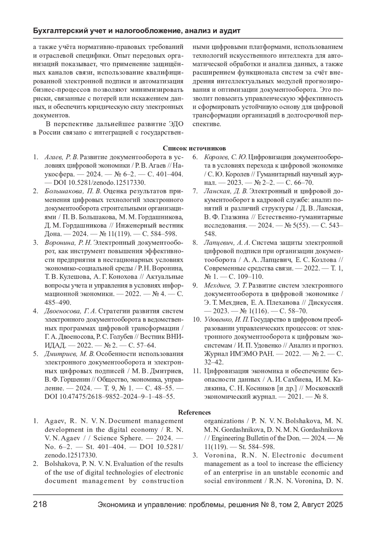 1. Агаев, Р. В. Развитие документооборота в условиях цифровой экономики / Р. В. Агаев // Наукосфера. - 2024. - № 6-2. - С. 401-404. DOI: 10.5281/zenodo.12517330 EDN: BFZOED