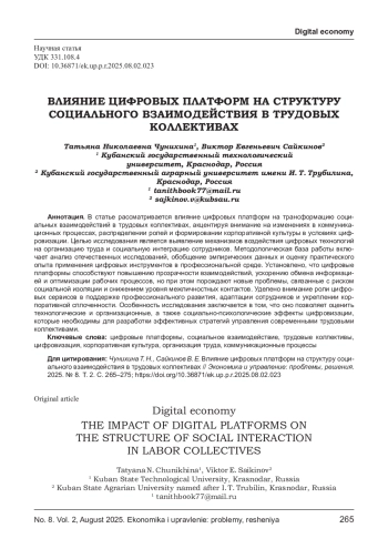 Целью исследования является выявление механизмов воздействия цифровых технологий на организацию труда и социальную интеграцию сотрудников. Методологическая база работы включает анализ отечественных исследований, обобщение эмпирических данных и оценку практического опыта применения цифровых инструментов в профессиональной среде. Установлено, что цифровые платформы способствуют повышению прозрачности взаимодействий, ускорению обмена информацией и оптимизации рабочих процессов, но при этом порождают новые проблемы, связанные с риском социальной изоляции и снижением уровня межличностных контактов. Уделено внимание роли цифровых сервисов в поддержке профессионального развития, адаптации сотрудников и укреплении корпоративной сплоченности. Особенность исследования заключается в том, что оно позволяет оценить технологические и организационные, а также социально - психологические эффекты цифровизации, которые необходимы для разработки эффективных стратегий управления современными трудовыми коллективами.