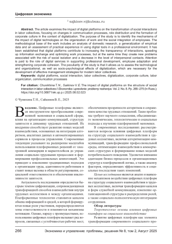 В статье рассматривается влияние цифровых платформ на трансформацию социальных взаимодействий в трудовых коллективах, акцентируя внимание на изменениях в коммуникационных процессах, распределении ролей и формировании корпоративной культуры в условиях цифровизации.