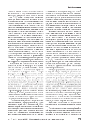 Цифровые платформы являются инструментом преобразования современной экономики и социальной сферы, влияя на организацию коммуникаций, структуру занятости и динамику трудовых отношений.