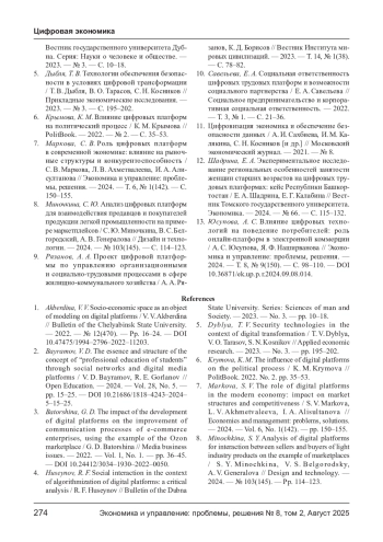 1. Акбердина, В. В. Социально-экономическое пространство как объект моделирования на цифровых платформах / В. В. Акбердина // Вестник Челябинского государственного университета. - 2022. - № 12(470). - С. 16-24. DOI: 10.47475/1994-2796-2022-11203