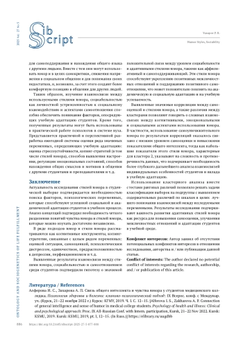 1. Алферова И. С., Захарова А. П. Связь общего интеллекта и чувства юмора у студентов медицинского колледжа. Психология здоровья и болезни: клинико-психологический подход: IX Всерос. конф. с Междунар. уч. (Курск, 21-22 ноября 2022 г.) Курск: КГМУ, 2019. Ч. I. С. 12-15. https://elibrary.ru/uugdbb