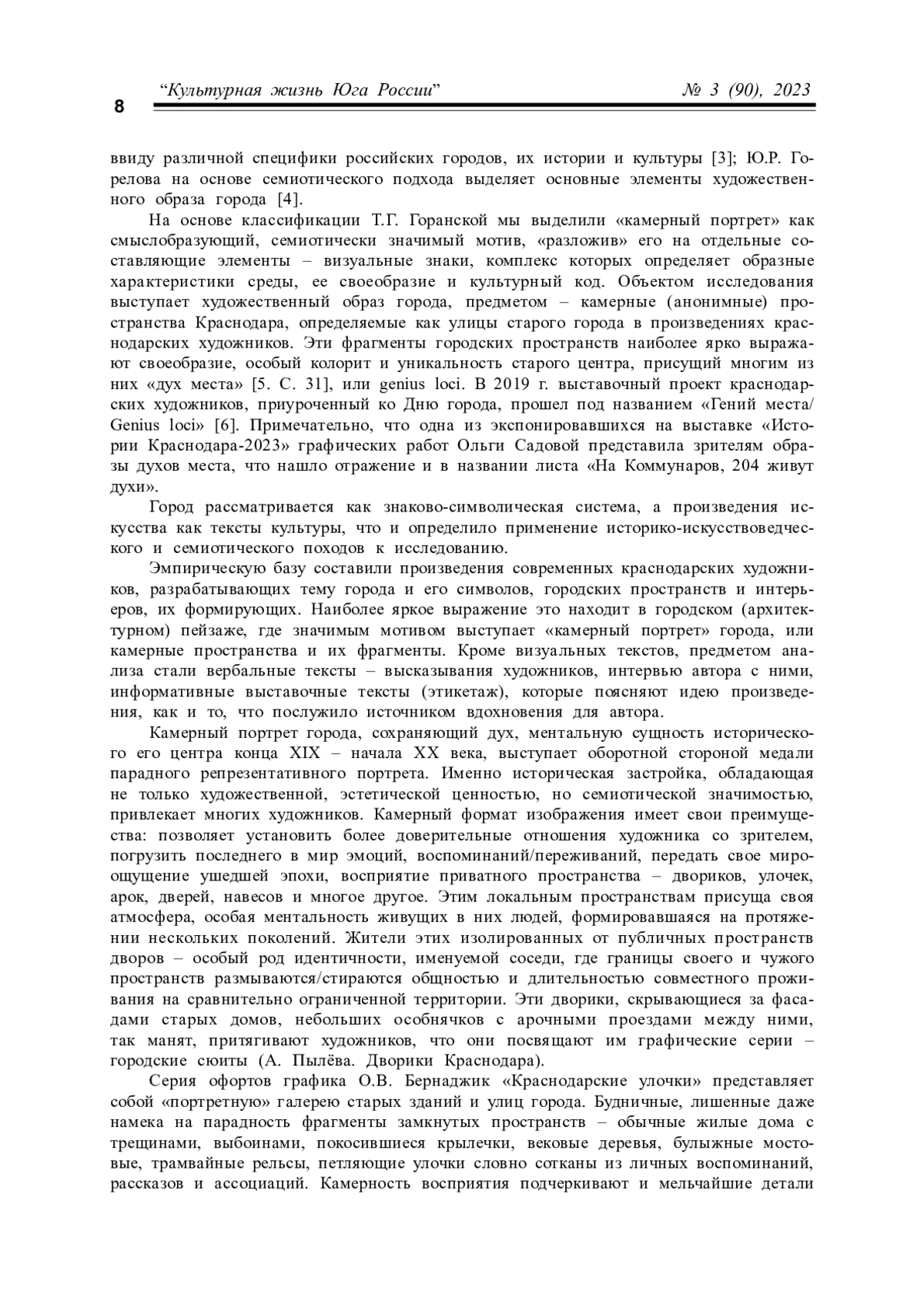 В статье на основе обширной эмпирической базы рассматриваются вопросы художественной интерпретации образа города в живописных и графических произведениях краснодарских художников. Из всего многообразия типов репрезентируемых в изобразительном искусстве пространств выделяются локальные камерные, чаще всего анонимные пространства, формирующие камерный портрет города с его особой ментальной характеристикой, идентичностью. На основе искусствоведческого подхода с позиций семиотики визуального текста анализируются изображения знаково-символических объектов, их фрагментов и элементов городских пространств в произведениях краснодарских художников разных поколений, школ, выявляются их образно-пластические характеристики, уровни символизации текста