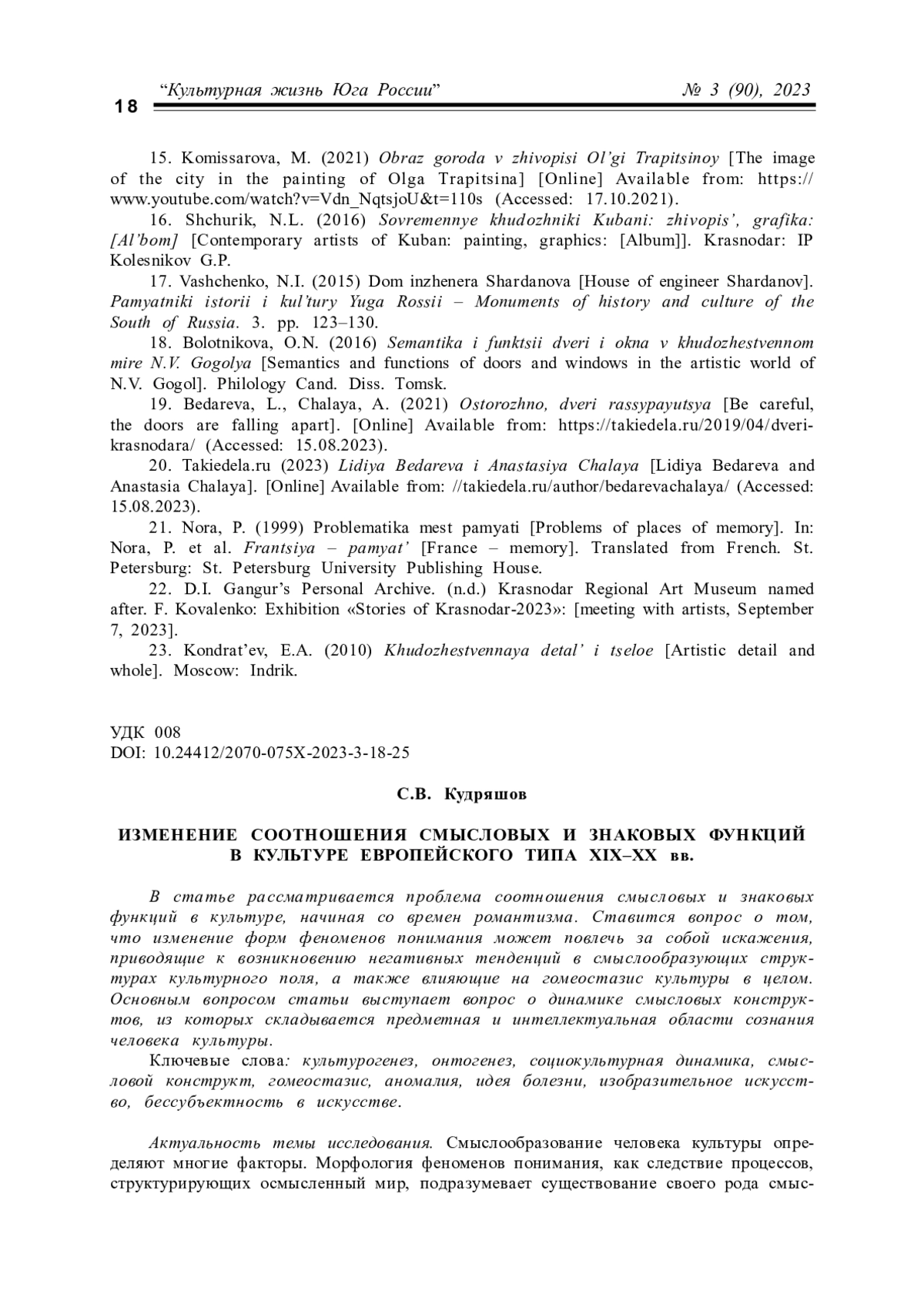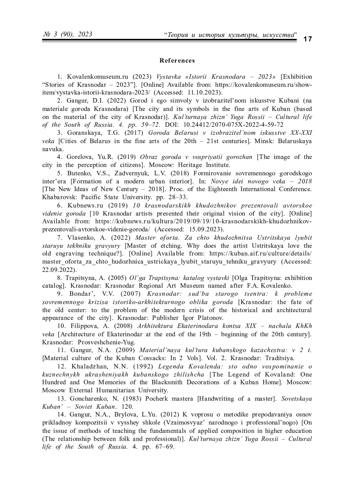 2. Гангур Д.И. Город и его символы в изобразительном искусстве Кубани (на материале города Краснодара) // Культурная жизнь Юга России. 2022. № 4. С. 59-72. EDN: CDCQAX