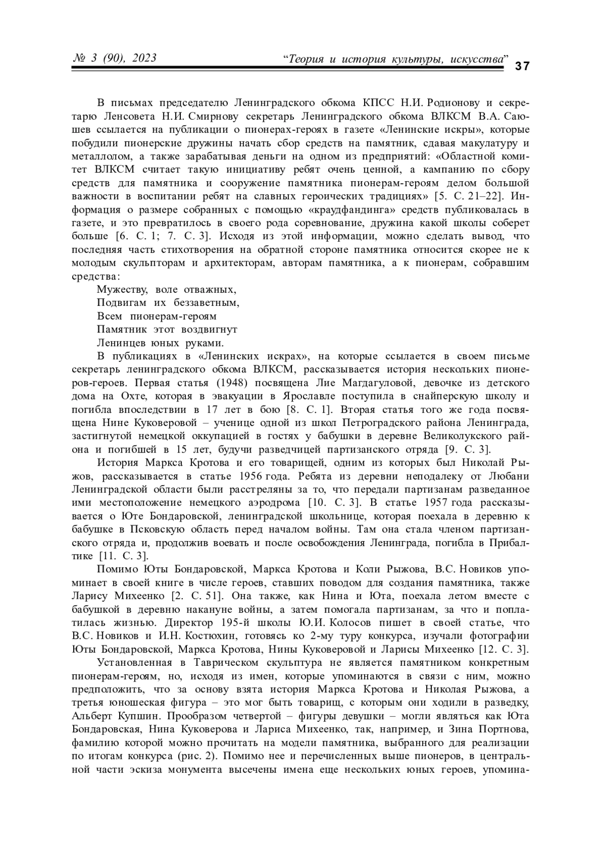 Памятник пионерам-героям, созданный авторским коллективом, который собрал вокруг себя В. С. Новиков, установлен в Таврическом саду в 1962 году (рис. 1). Помимо самого В. С. Новикова, в авторский коллектив вошли его товарищи с учебных лет: скульптор И. Н. Костюхин и архитектор А. И. Алымов, а также архитектор Ф. А. Гепнер, который подключился к работе на завершающем этапе и в конкурсе на памятник не участвовал. Реализованный памятник, как и проекты, конкурировавшие с ним на этапе конкурса, дают возможность проследить эволюцию в советском монументальном искусстве в связи с послаблениями в культурной политике во второй половине 1950-х гг.