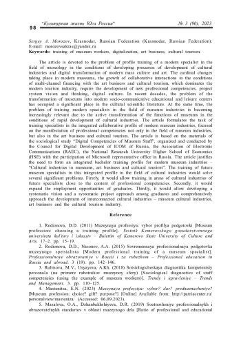 Статья посвящена проблеме профильной подготовки современного специалиста в области музееологии в условиях развития культурных индустрий и цифровой трансформации современной массовой культуры и искусства. Происходящие в современных музеях кардинальные изменения, нарастание коллаборативных взаимодействий в условиях многоканального финансирования с арт-бизнесом и культурным туризмом, доминирующим в современной туристской индустрии, требуют развития новых профессиональных компетенций, проектного системного видения и мышления, цифровой культуры