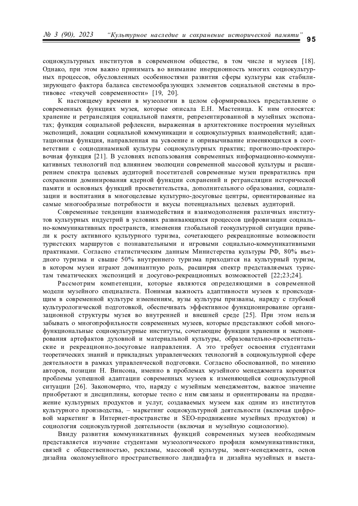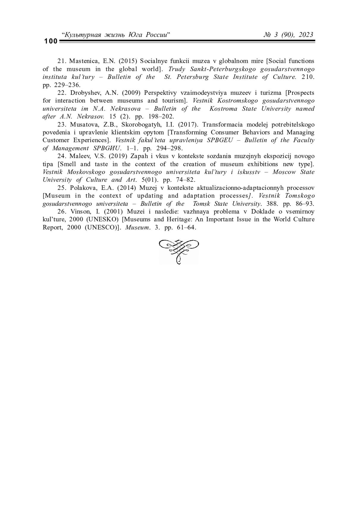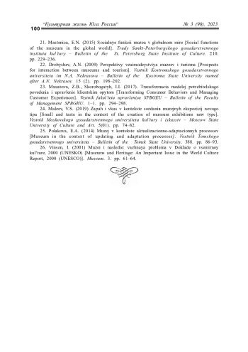 25. Полякова Е.А. Музей в контексте актуализационно-адаптационных процессов // Вестник Томского государственного университета. 2014. № 388. С. 86-93. EDN: TALBXP