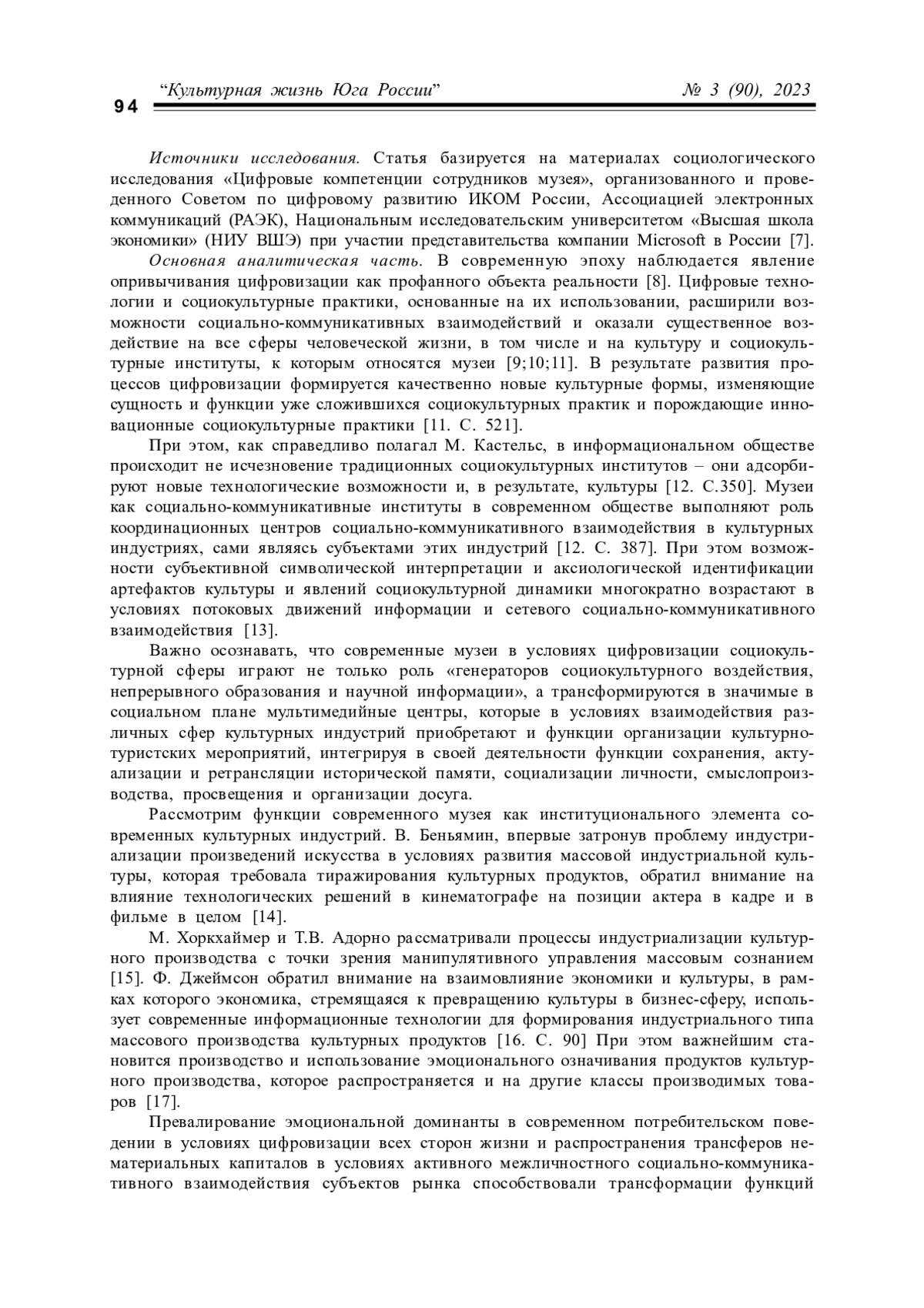10. Астафьева О.Н. Культура в цифровой цивилизации: новый этап осмысления стратегии будущего для устойчивого развития // Обсерватория культуры. 2018. Т. 15. № 5. С. 516-531. EDN: YQICAP
