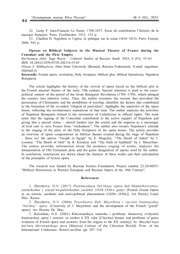 В статье освещается история возрождения оперы на библейские сюжеты в музыкальном театре Франции XIX века. Особое внимание в работе уделяется историко-культурному контексту периода Великой французской буржуазной революции, погрузившей страну в атеистические воззрения, а также деятельности Наполеона Бонапарта, восстановившего в правах католицизм. Автором раскрывается отношение императора к постановке опер на сюжеты Священного Писания и дается краткая характеристика сочинений, созданных в период его правления, – опер «Иосиф в Египте» Э. Мегюля, «Смерть Адама» Ж. Лесюэра, «Смерть Авеля» Р. Крейцера и «Клятва Иеффая» Дж. Мейербера. В заключении сделаны выводы об особенностях данных произведений и предвосхищении ими принципов жанра французской лирической оперы.