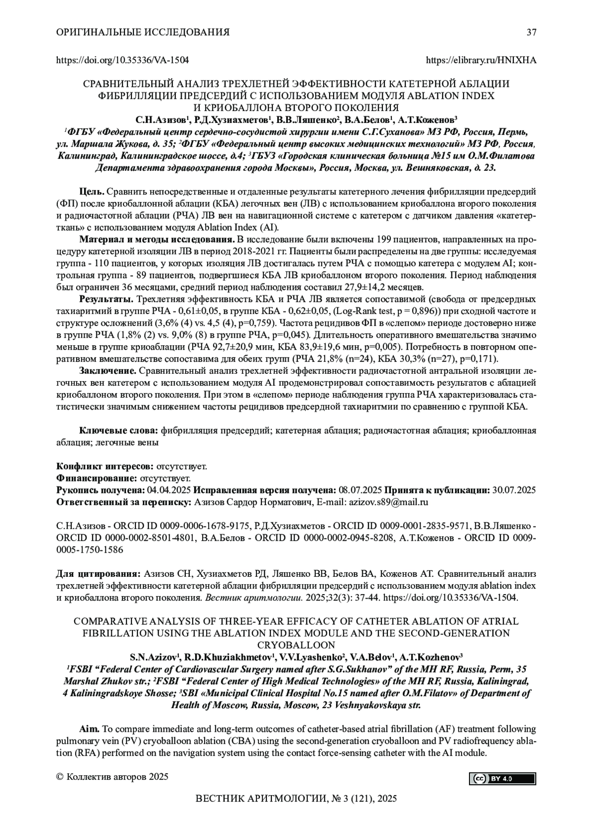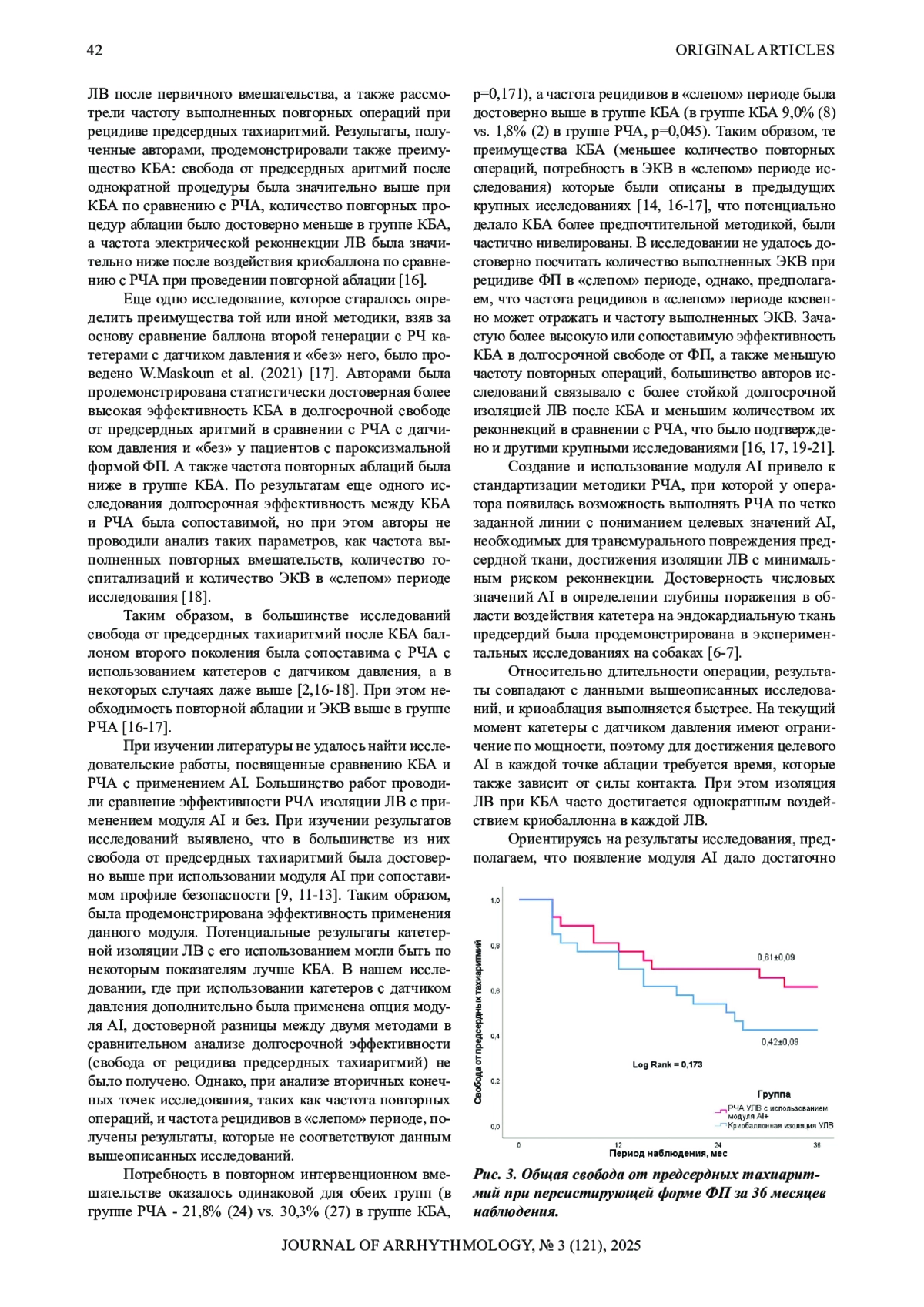 Заключение. Сравнительный анализ трехлетней эффективности радиочастотной антральной изоляции легочных вен катетером с использованием модуля AI продемонстрировал сопоставимость результатов с аблацией криобаллоном второго поколения. При этом в «слепом» периоде наблюдения группа РЧА характеризовалась статистически значимым снижением частоты рецидивов предсердной тахиаритмии по сравнению с группой КБА.