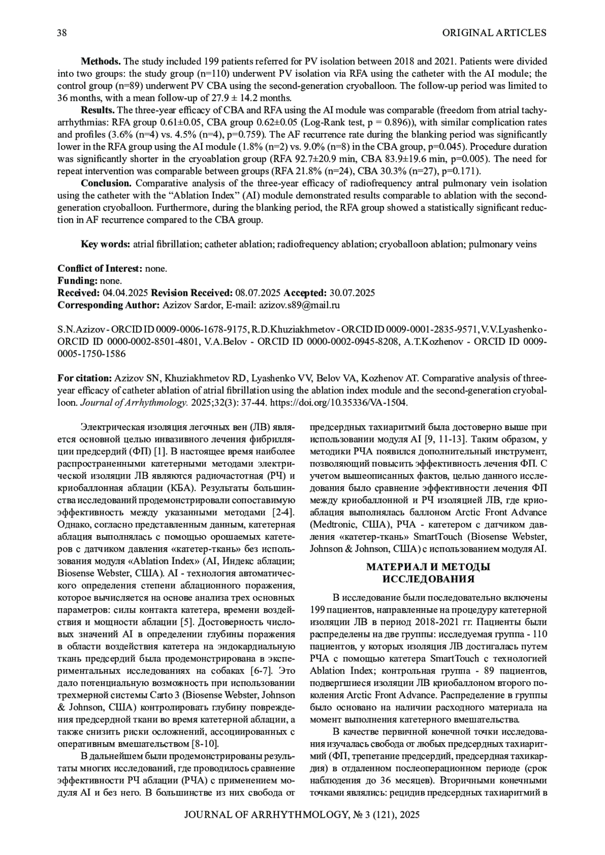 Материал и методы исследования. В исследование были включены 199 пациентов, направленных на процедуру катетерной изоляции ЛВ в период 2018-2021 гг. Пациенты были распределены на две группы: исследуемая группа - 110 пациентов, у которых изоляция ЛВ достигалась путем РЧА с помощью катетера с модулем AI; контрольная группа - 89 пациентов, подвергшиеся КБА ЛВ криобаллоном второго поколения. Период наблюдения был ограничен 36 месяцами, средний период наблюдения составил 27,9±14,2 месяцев.