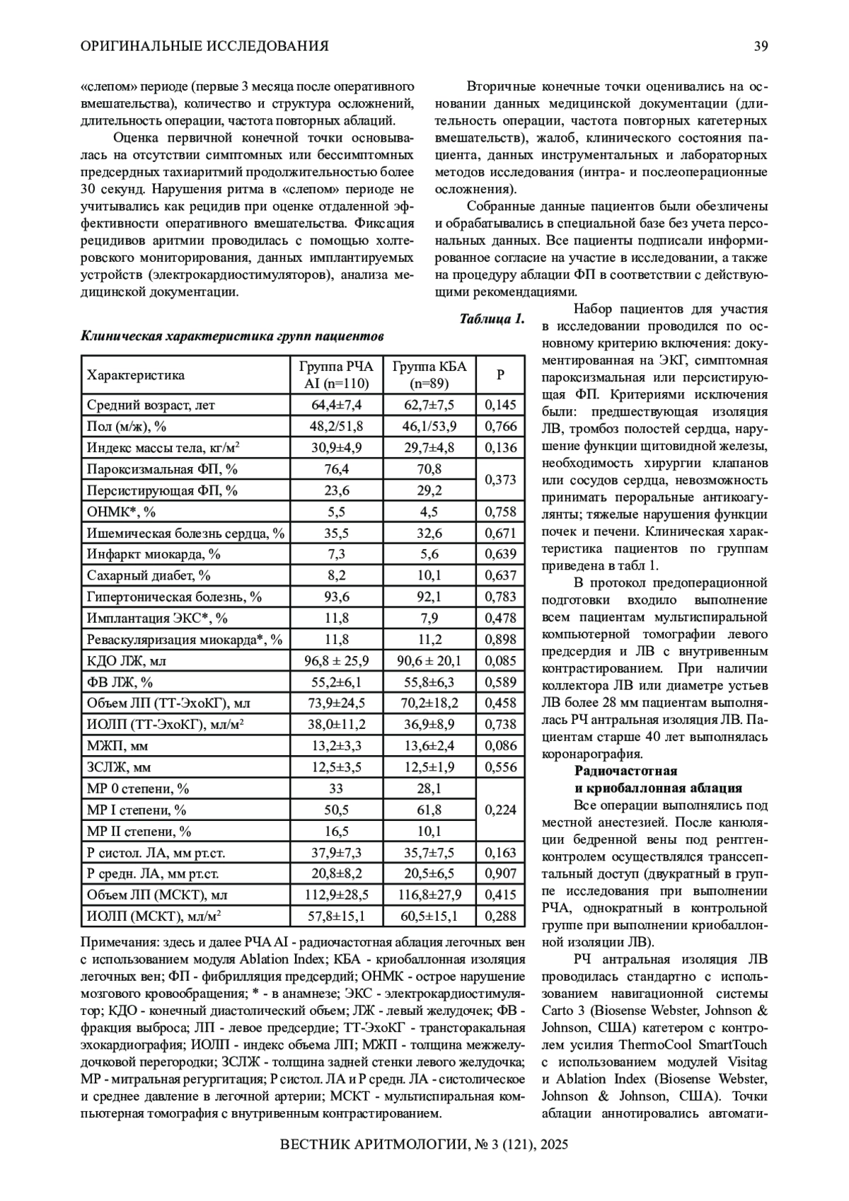 Результаты. Трехлетняя эффективность КБА и РЧА ЛВ является сопоставимой (свобода от предсердных тахиаритмий в группе РЧА - 0,61±0,05, в группе КБА - 0,62±0,05, (Log-Rank test, p = 0,896)) при сходной частоте и структуре осложнений (3,6% (4) vs. 4,5 (4), p=0,759). Частота рецидивов ФП в «слепом» периоде достоверно ниже в группе РЧА (1,8% (2) vs. 9,0% (8) в группе РЧА, p=0,045). Длительность оперативного вмешательства значимо меньше в группе криоаблации (РЧА 92,7±20,9 мин, КБА 83,9±19,6 мин, p=0,005). Потребность в повторном оперативном вмешательстве сопоставима для обеих групп (РЧА 21,8% (n=24), КБА 30,3% (n=27), p=0,171).