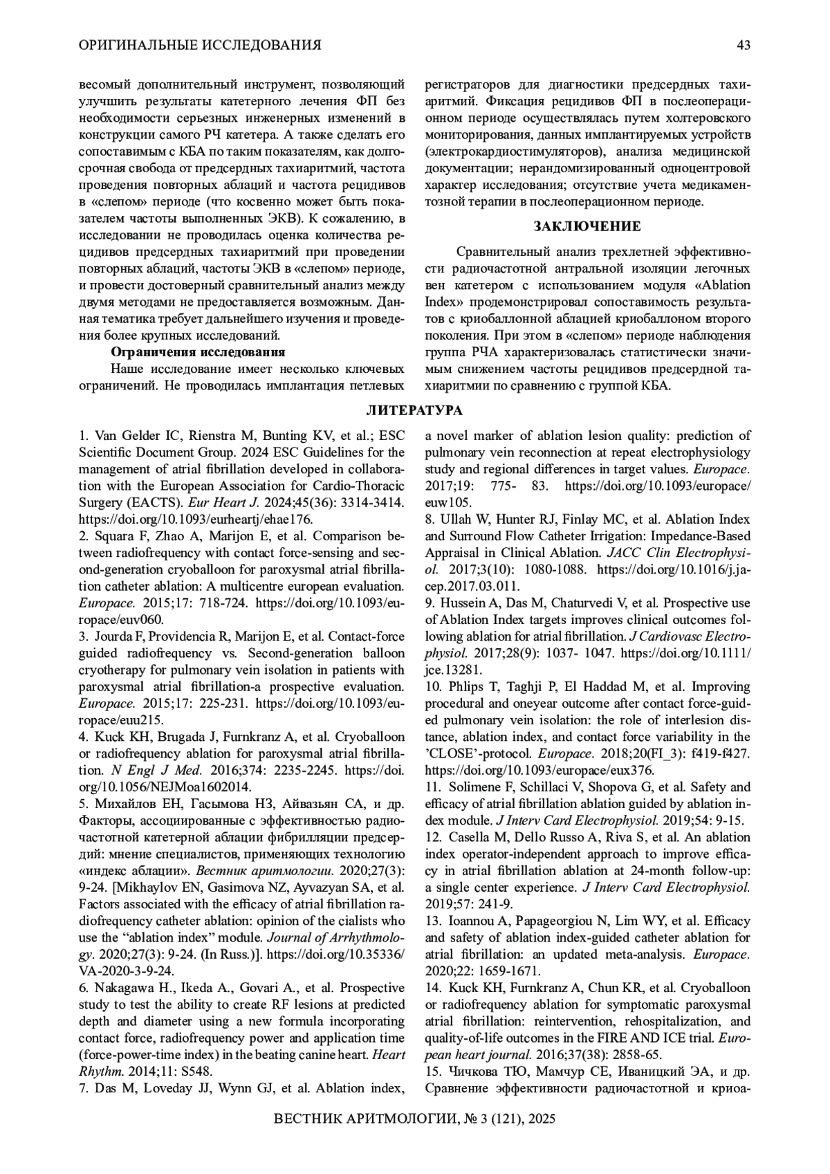 17. Артюхина ЕА, Сатинбаев ЗИ. Катетерная аблация с использованием технологии “индекс аблации”. Анналы аритмологии. 2022;19(1): 32-38.