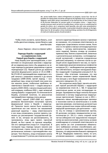 В статье на основе проведенного автором исследования истории принятия закона о противодействии коррупции и изменения уголовного законодательства в сфере борьбы с коррупционными преступниками, а также на основе статистической регистрации и основной статистики по основным коррупционным вирусам формулируются правила борьбы с коррупцией в России. Они сформулировали следующее. Первый урок: Высочайший криминологический просчет последствий Изменение законодательства абсолютно необходимо. Второй урок: Борьба с потенциалом коррупционных преступников - взяточничеством (в стране) не может быть направлено строго ни на взяткодателей (как сейчас), ни на взяткопополучателей. Коррупция - двухсторонняя преступная сделка, нужно бороться с обеих сторон, чтобы сдвинуться с мертвой точки. Третий урок по борьбе с коррупцией в регионе: ужесточение санкций не приводит к снижению преступности. Нужно искать иные пути воздействия на нее. Кроме того, необходимо провести расследование наказаний за коррупционные преступления с проявлениями того, что установлены условно ценовые преступления, - за убийства, тяжкий вред здоровью, насильственные посягательства на имущество. Четвертый урок: варианты видов наказаний за получение взятки должны быть законодательно расширены. В их число должны появиться и обязательные работы (однако с корректировками этого вида в Общей части УК РФ для лиц, совершивших коррупционные преступления, - определение количества часов, привязкой этих социальных работ к мобильным и публичным в точках общественного питания, ужесточением замен этих карантинных и т. д.), принудительные работы (возможно, тоже с корректировкой условий). Пятый урок борьбы с коррупцией: свобода свободы на определенный срок должна быть законодательно снижена в отношении всех коррупционных преступлений, обязательств со взяточничеством; Из-за санкций всех посягательств, относящихся к нынешним врагам небольшой и средней тяжести, его вообще следует ожидать.