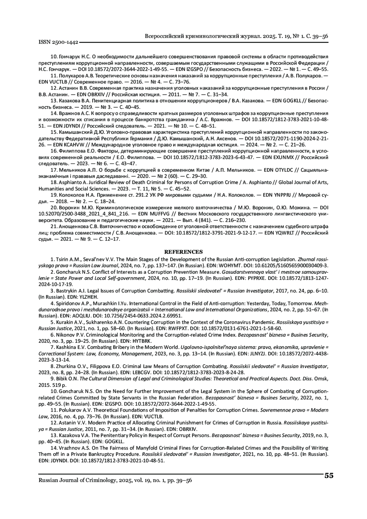 10. Гончарук Н.С. О необходимости в дальнейшем привести в действие систему в области противодействия преступной коррупционной направленности, которую оказывают государственные служащие в Российской Федерации / Н.С. Гончарук. // Безопасность бизнеса. - 2022. - № 1. - С. 49-55. DOI: 10.18572/2072-3644-2022-1-49-55 EDN: ИЗГСПО