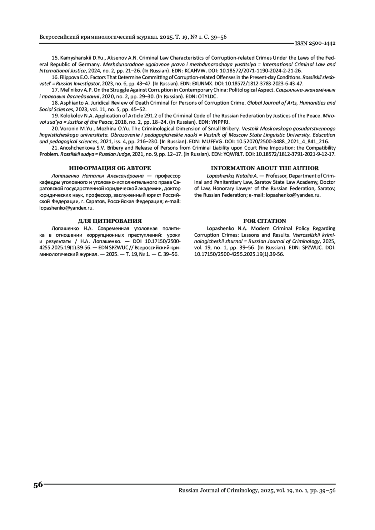 15. Камышанский Д.Ю. Уголовно-правовая характеристика последствий коррупционной направленности в законодательстве Федеративной Республики Германия / Д.Ю. Камышанский, А.Н. Аксенов. // Международное уголовное право и международная юстиция. - 2024. - № 2. - С. 21-26. DOI: 10.18572/2071-1190-2024-2-21-26 EDN: KCAHVW