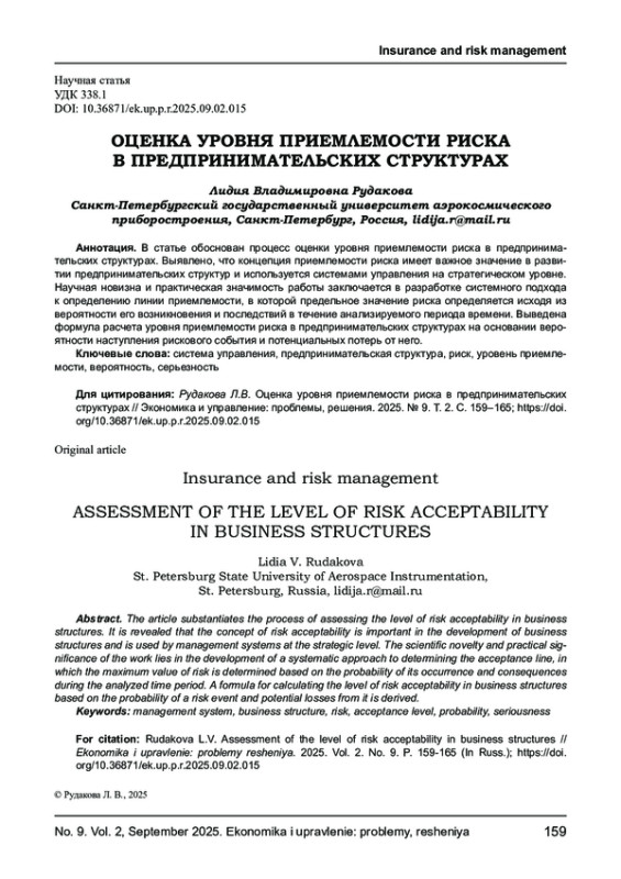 8. Рудакова Л.В. Основные методы анализа рисков в предпринимательских структурах // Научно-практический теоретический журнал “Экономика и управление: проблемы, решения” М.: ИД “Научная библиотека”. 2025. Т.1, № 6. С.47-55.