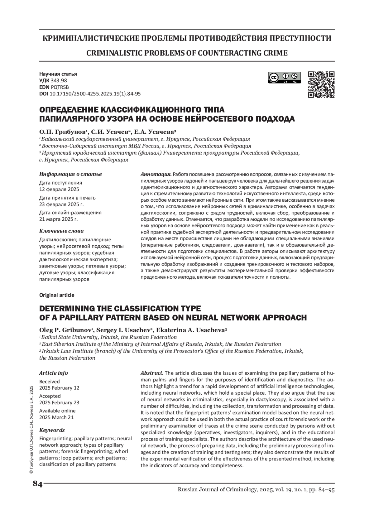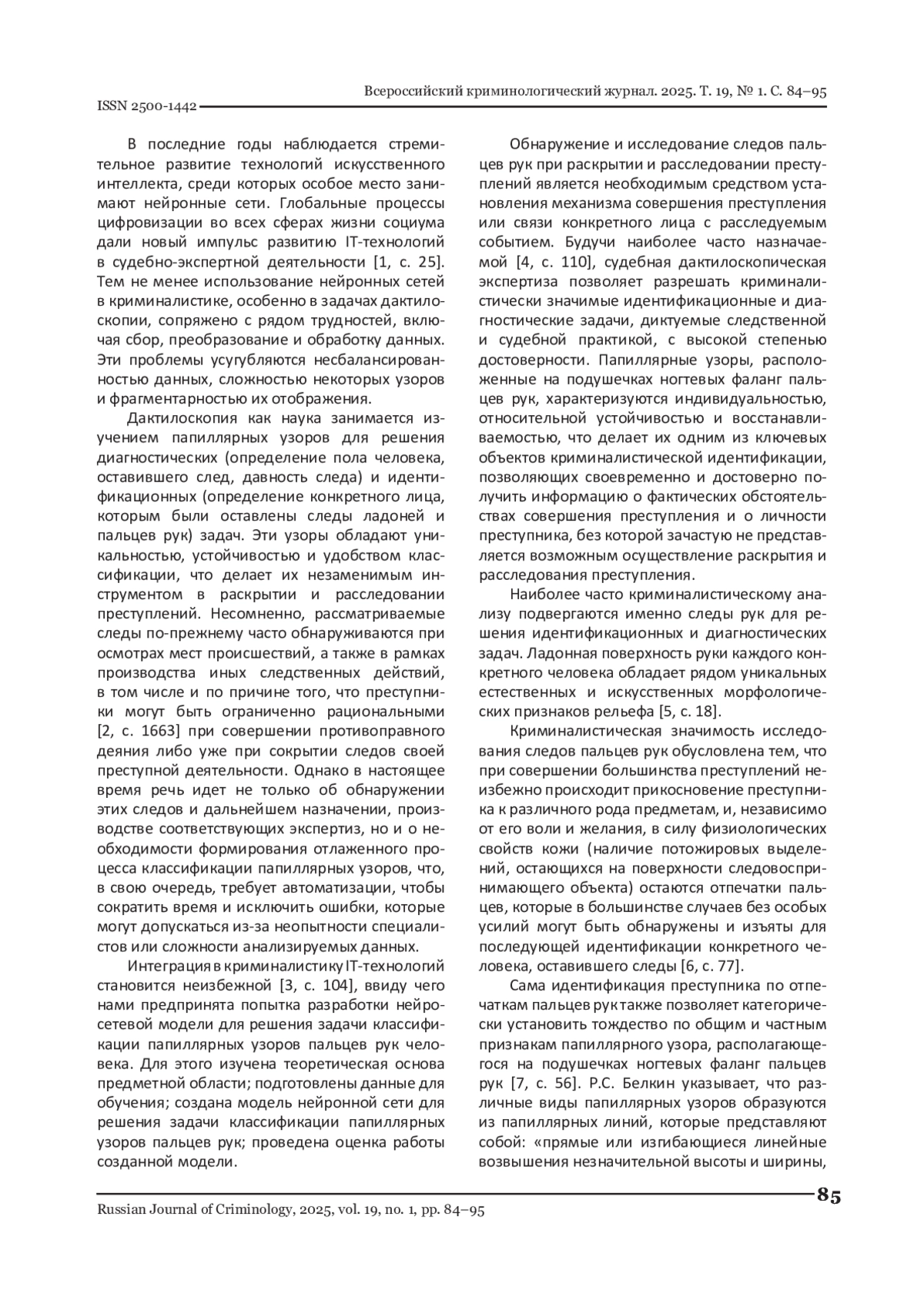 Работа посвящена рассмотрению вопросов, связанных с изучением папиллярных узоров ладоней и пальцев рук человека для дальнейшего решения задач идентификационного и диагностического характера. Авторами отмечается тенденция к стремительному развитию технологий искусственного интеллекта, среди которых особое место занимают нейронные сети. При этом также высказывается мнение о том, что использование нейронных сетей в криминалистике, особенно в задачах дактилоскопии, сопряжено с рядом трудностей, включая сбор, преобразование и обработку данных. Отмечается, что разработка модели по исследованию папиллярных узоров на основе нейросетевого подхода может найти применение как в реальной практике судебной экспертной деятельности и предварительном исследовании следов на месте происшествия лицами не обладающими специальными знаниями (оперативные работники, следователи, дознаватели), так и в образовательной деятельности для подготовки специалистов. В работе авторы описывают архитектуру используемой нейронной сети, процесс подготовки данных, включающий предварительную обработку изображений и создание тренировочного и тестового наборов, а также демонстрируют результаты экспериментальной проверки эффективности предложенного метода, включая показатели точности и полноты.