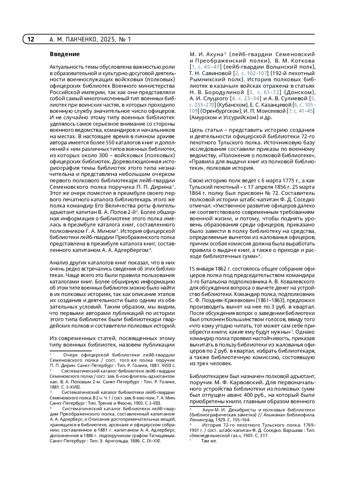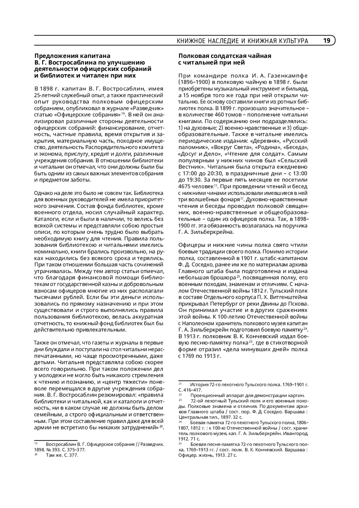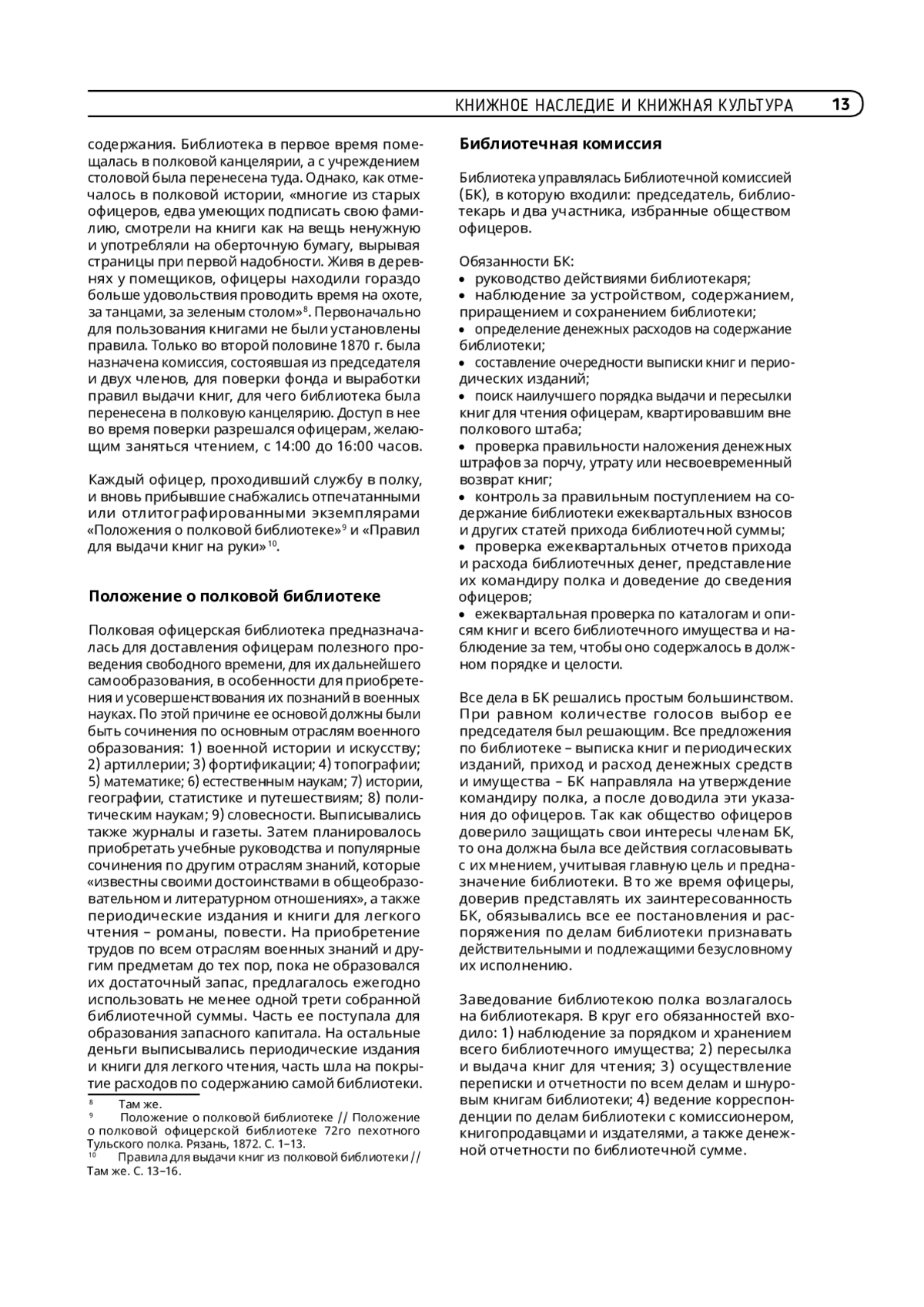 1. Котков В. М. «Военная специальность… требует в настоящее время весьма разнообразных и солидных познаний…». Роль библиотек в Русской Императорской армии на примере лейб-гвардии Волынского полка // Военно- исторический журнал. 2016. № 7. С. 45-47.