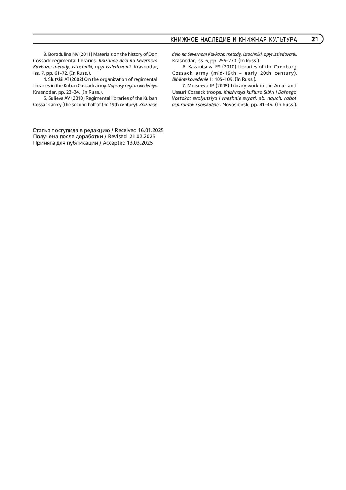7. Моисеева И. П. Библиотечное дело в Амурском и Уссурийском казачьих войсках // Книжная культура Сибири и Дальнего Востока: эволюция и внешние связи : сб. науч. работ аспирантов и соискателей. Новосибирск, 2008. С. 41-45.