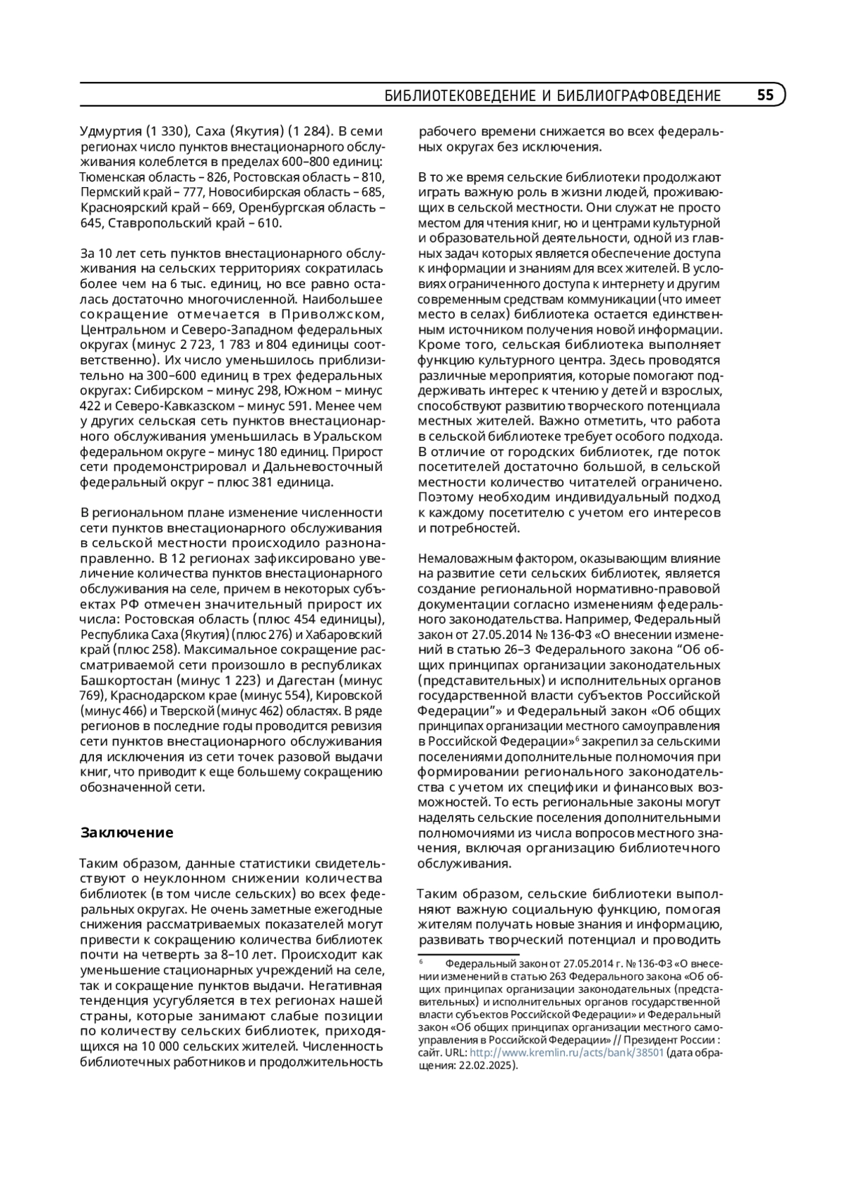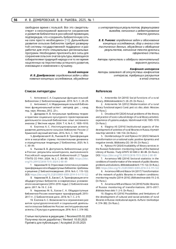 5. Домбровская И. В., Рыкова В. В. Трансформация сети в масштабах страны: положительная динамика и отрицательные тенденции // Библиотека. 2025. № 3. С. 30-39.