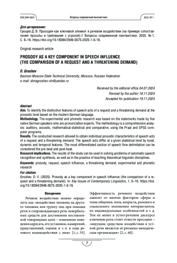 Цель. Выявить отличительные признаки речевых актов просьбы и требования с угрозой на уровне просодии на материале современного немецкого языка.