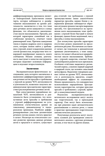 11. Грошев Д. В. Угрожающее требование как категоричная форма требования с отличительными особенностями на уровне просодии (Threatening Demand as a Categorical Form of a Demand with Distinguishing Features at the Prosodic Level) // Наука, технологии и бизнес: IV Межвузовская конференция аспирантов, соискателей и молодых учёных (Москва, 27-28 апреля 2022 г.) = Science, Engineering and Business: Conference Proceedings and Papers IV Interacademic Conference for Graduate Students and Young Researchers (Moscow, April 27-28, 2022). М.: Издательство МГТУ им. Н. Э. Баумана, 2022. С. 24-30. EDN: OOJLON