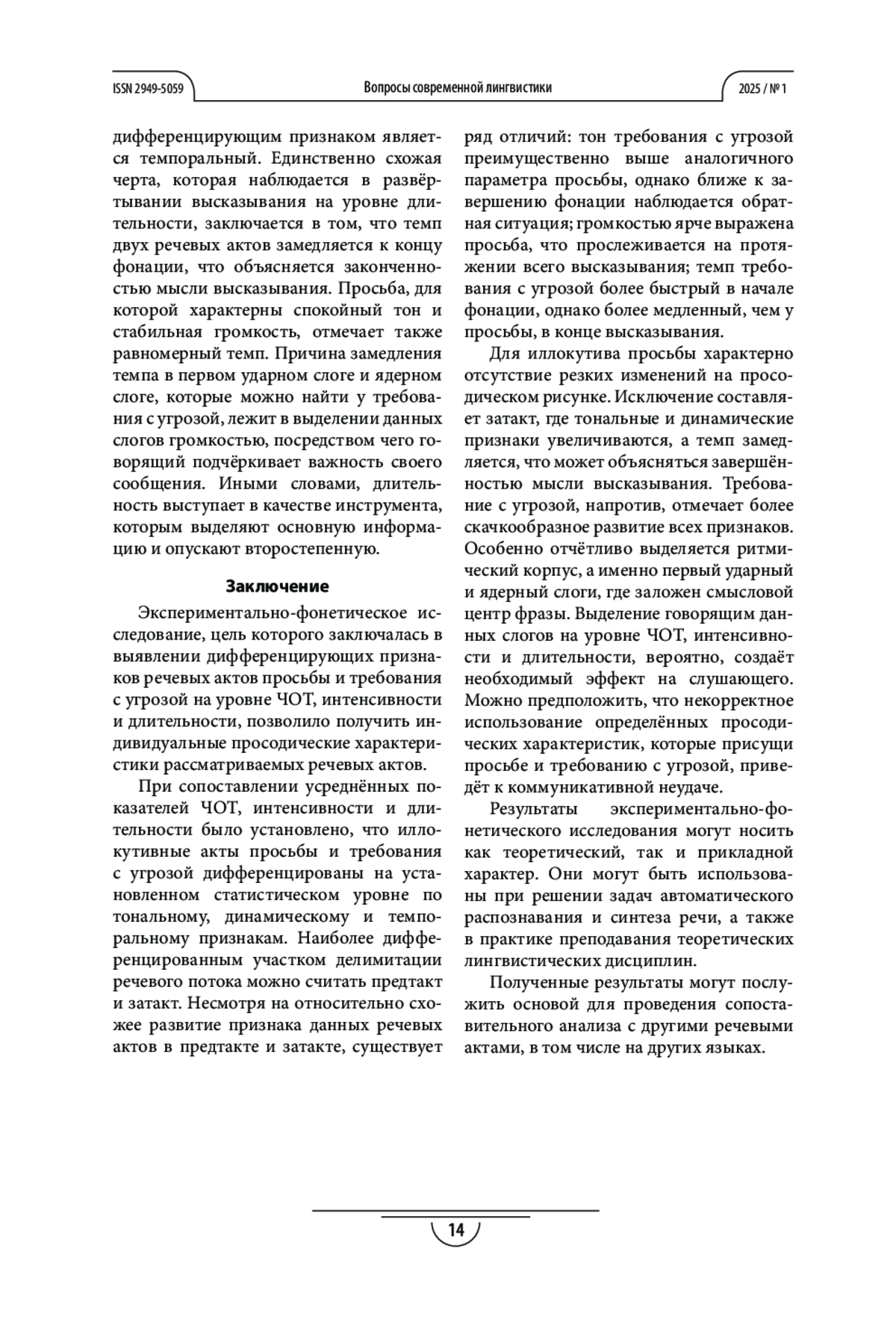 Результаты. Проведённое исследование позволило получить индивидуальные просодические характеристики речевых актов просьбы и требования с угрозой. Рассматриваемые речевые акты различаются на заданном статистическом уровне по тональному, динамическому и темпоральному признакам. Наиболее дифференцированным участком делимитации речевого потока можно считать предтакт и затакт.