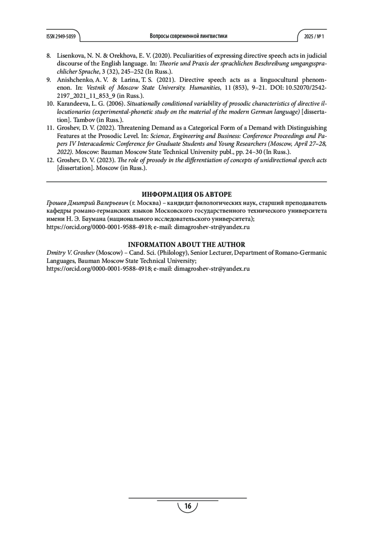 12. Грошев Д. В. Роль просодии в дифференциации концептов однонаправленных речевых актов: дис. … канд. филол. наук. М., 2023. 166 с.