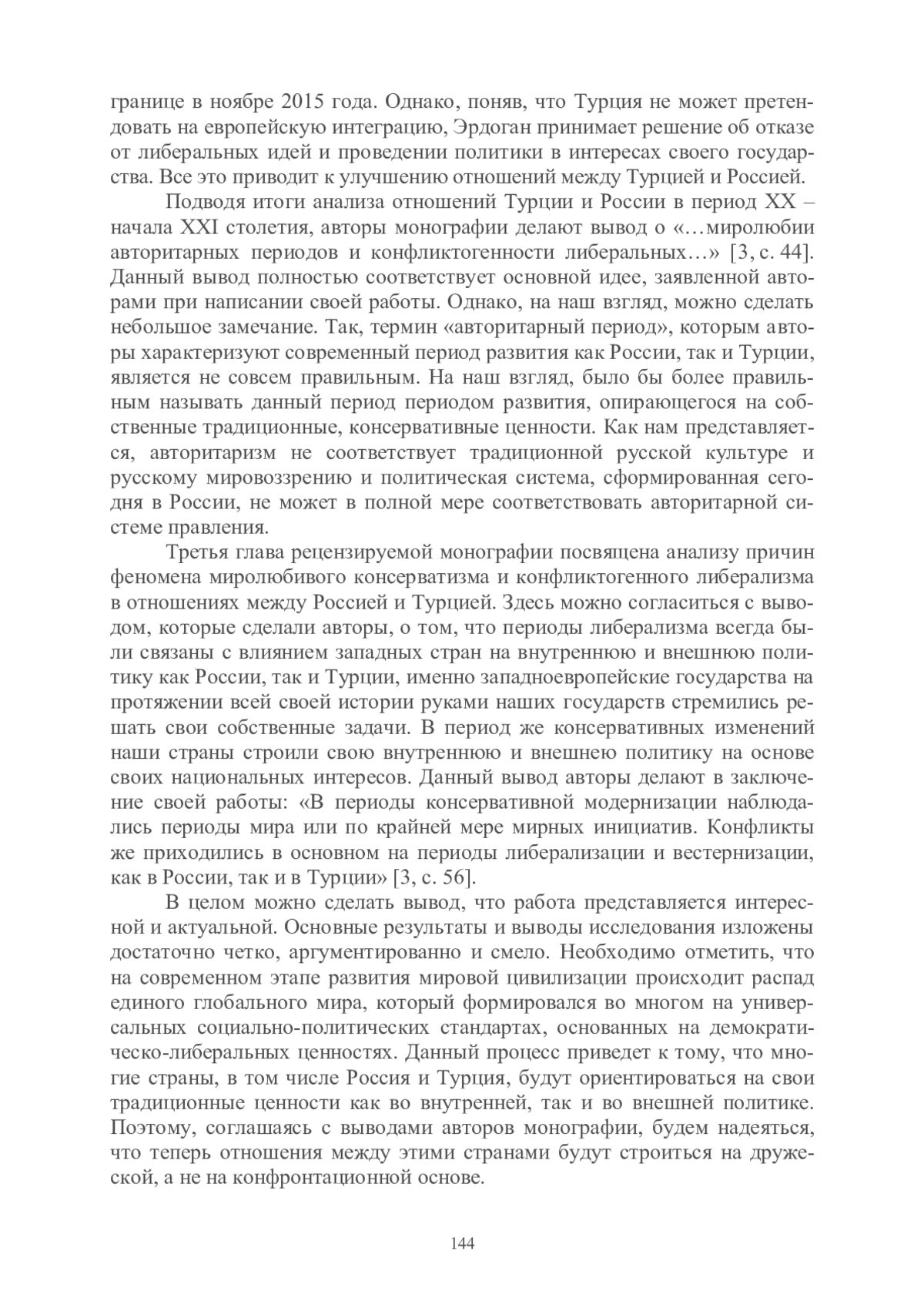 Монография Р. Р. Вахитова и В. К. Петрова «Российско-турецкие отношения в периоды консервативных и либеральных модернизаций XIX– XXI вв.» написана на важную и актуальную тему, которая наиболее востребована в настоящее время. Сегодня происходит распад глобального мира и формирование новых центров геополитического влияния. Именно такими центрами на протяжении всей своей истории были как Турция, так и Россия. Поэтому обращение к истории взаимоотношения этих стран вызывает особый интерес.