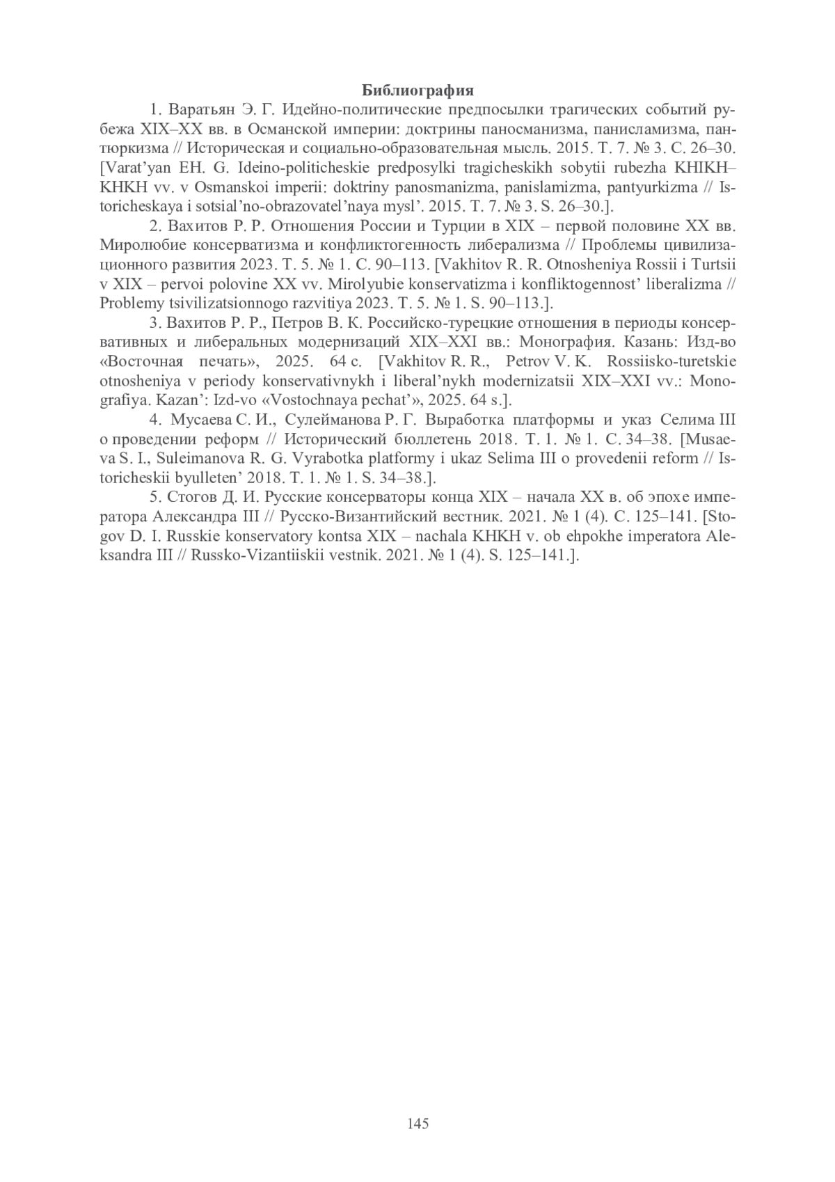 2. Вахитов Р. Р. Отношения России и Турции в XIX - первой половине XX вв. Миролюбие консерватизма и конфликтогенность либерализма // Проблемы цивилизационного развития 2023. Т. 5. № 1. С. 90-113. EDN: YSHCIQ