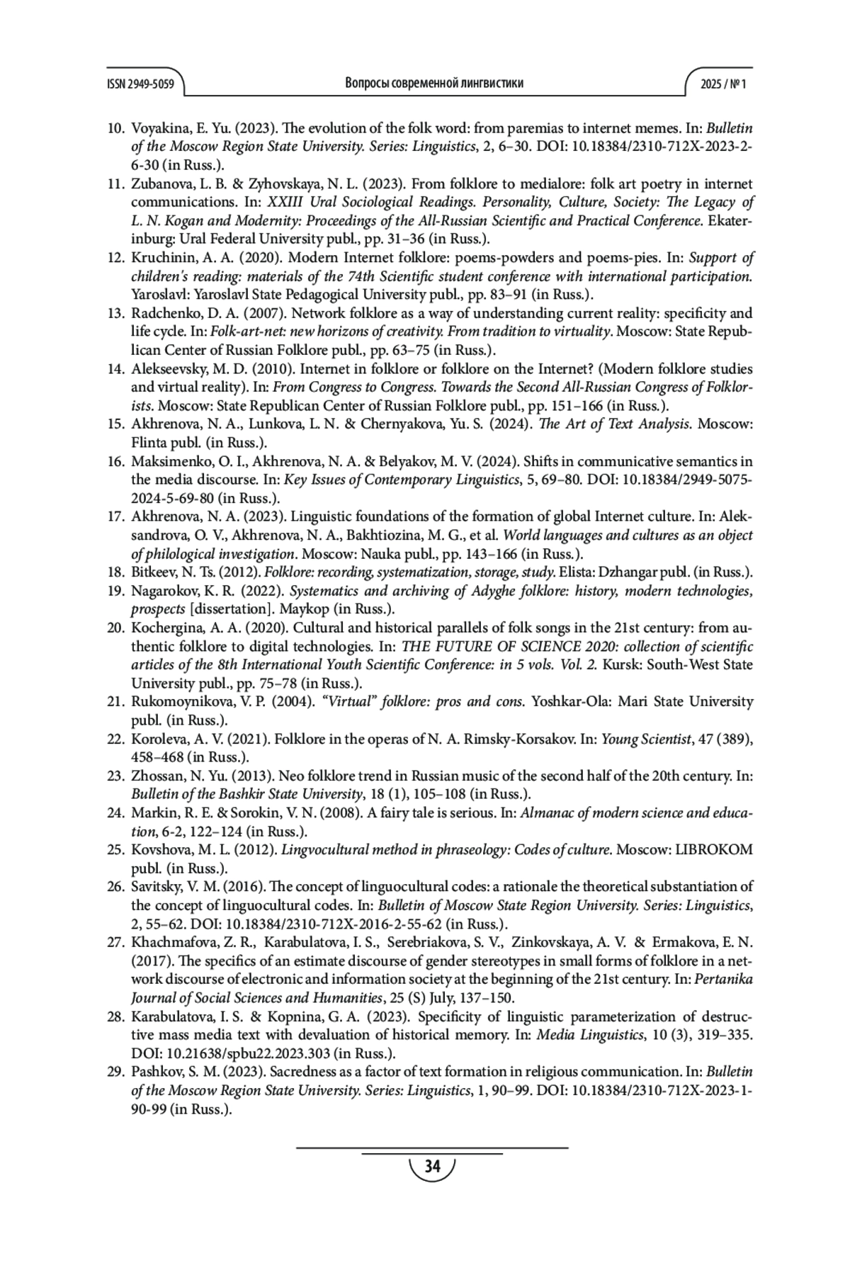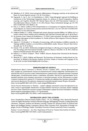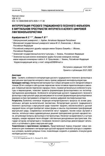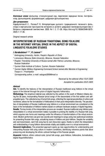 Статья: ИНТЕРПРЕТАЦИИ РУССКОГО ТРАДИЦИОННОГО ПЕСЕННОГО ФОЛЬКЛОРА В ВИРТУАЛЬНОМ ПРОСТРАНСТВЕ ИНТЕРНЕТА В АСПЕКТЕ ЦИФРОВОЙ ЛИНГВОФОЛЬКЛОРИСТИКИ (2025)