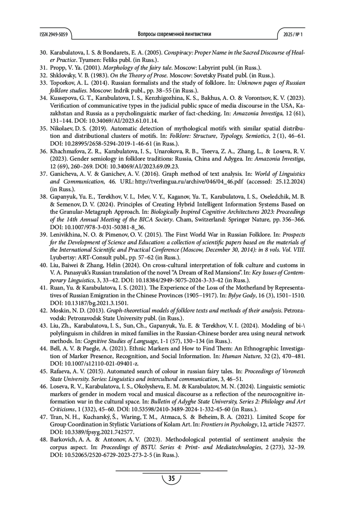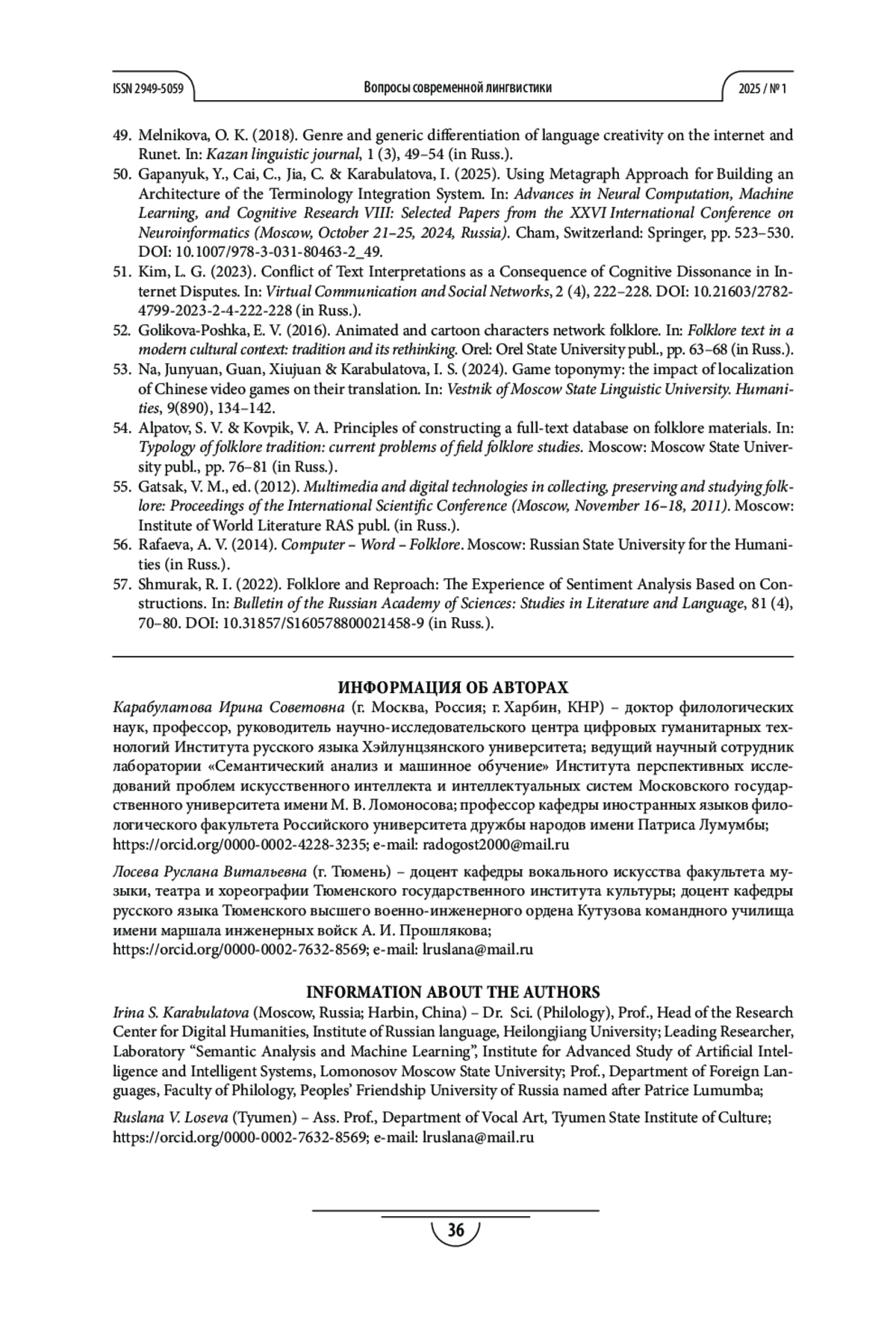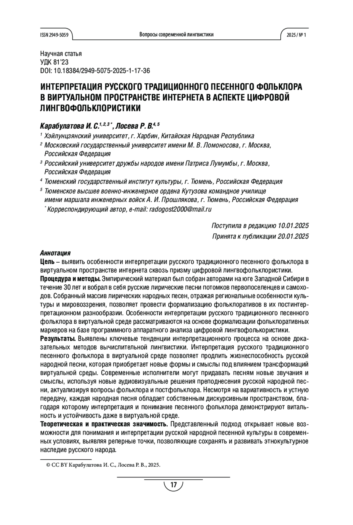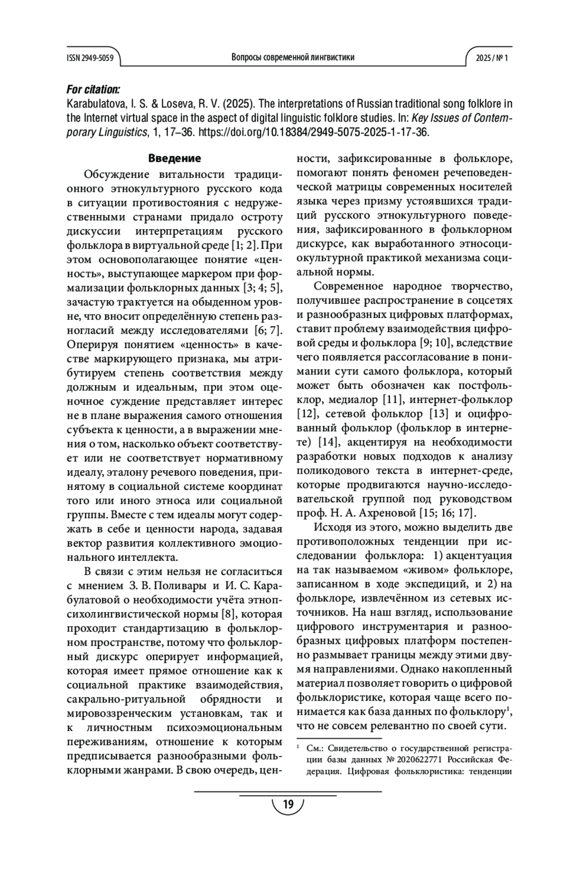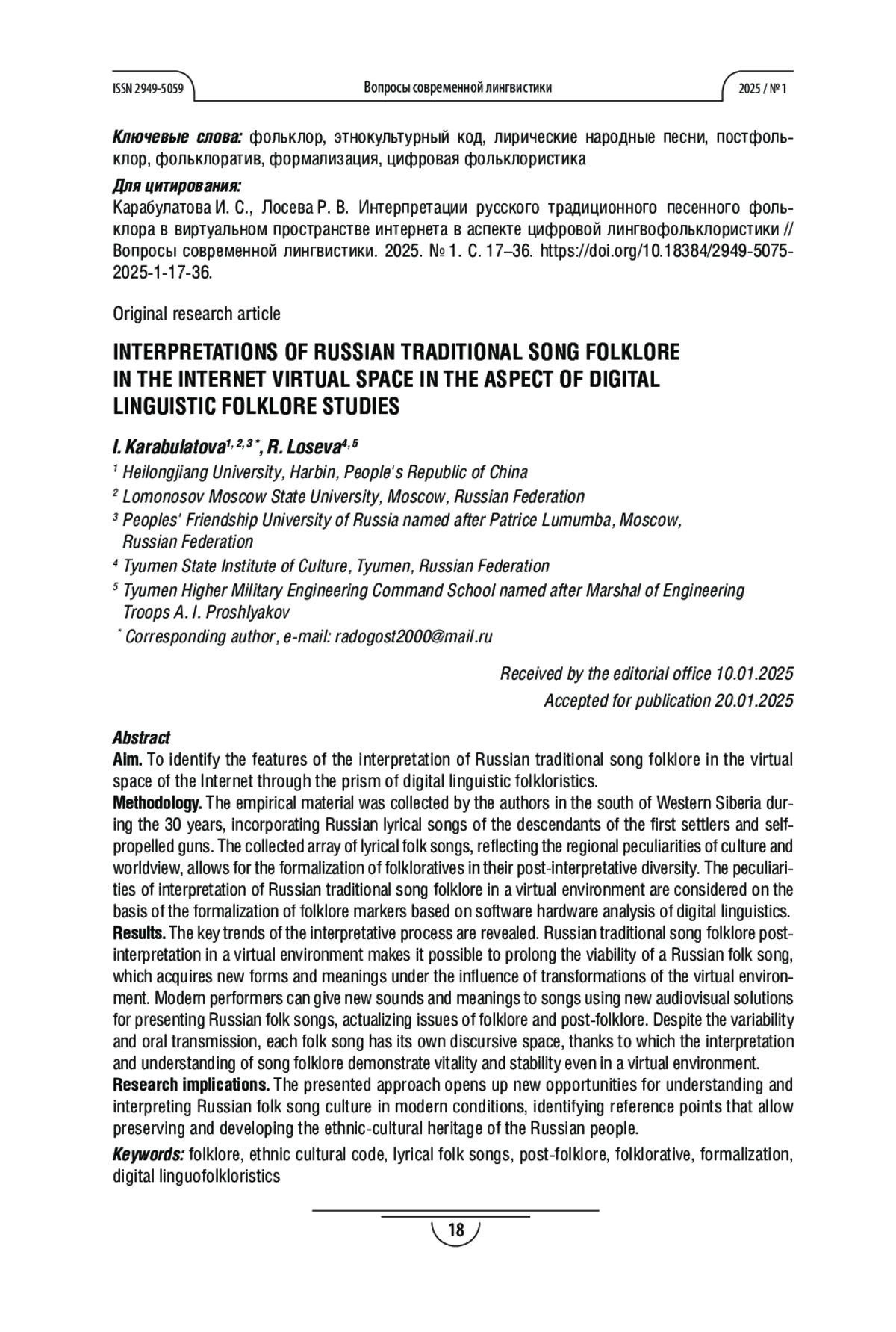 КАРАБУЛАТОВА И. С., ЛОСЕВА Р. В. ИНТЕРПРЕТАЦИИ РУССКОГО ТРАДИЦИОННОГО ПЕСЕННОГО ФОЛЬКЛОРА В ВИРТУАЛЬНОМ ПРОСТРАНСТВЕ ИНТЕРНЕТА В АСПЕКТЕ ЦИФРОВОЙ ЛИНГВОФОЛЬКЛОРИСТИКИ // ВОПРОСЫ СОВРЕМЕННОЙ ЛИНГВИСТИКИ. 2025. № 1