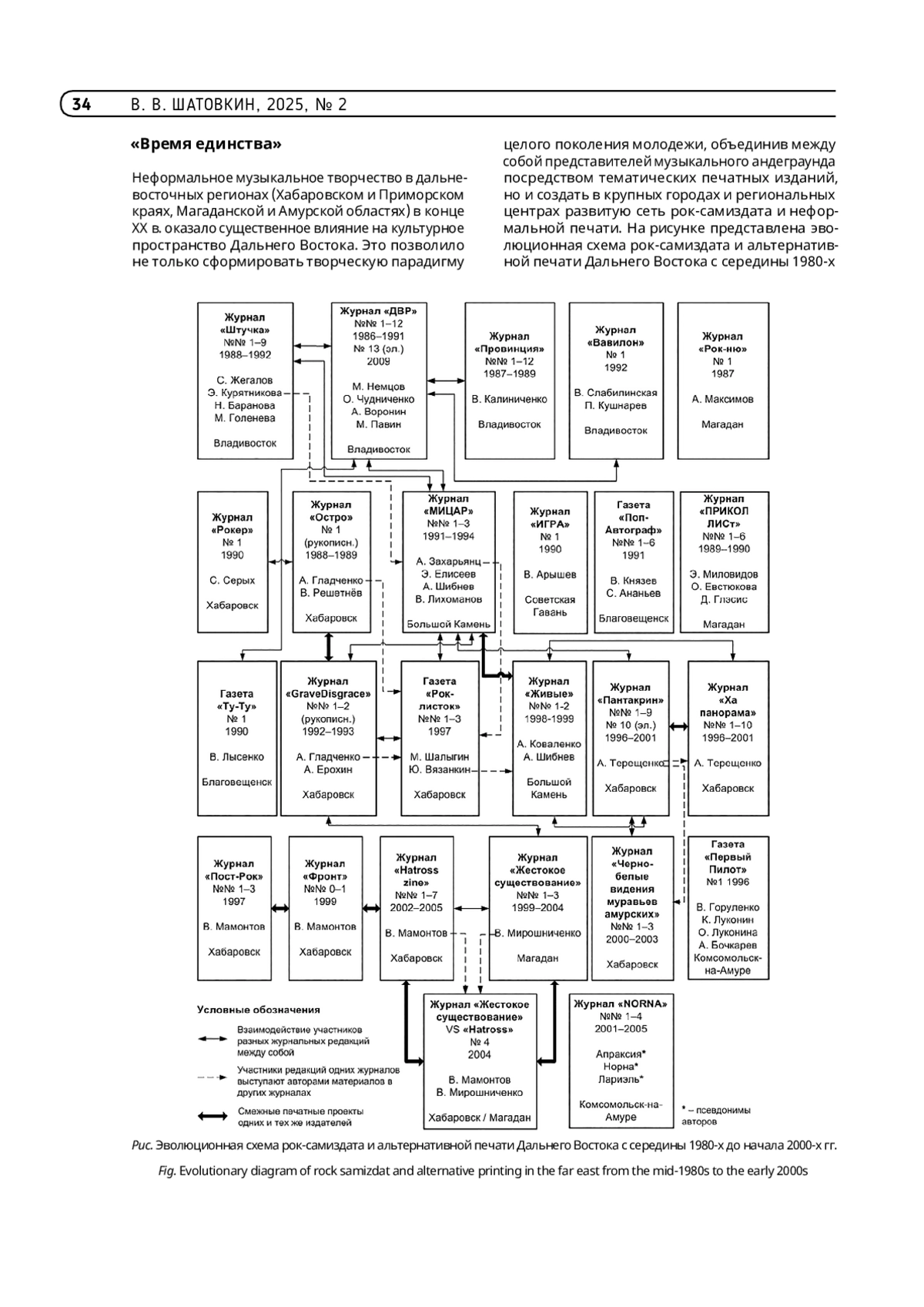 Приводятся эволюционные схемы дальне-восточного рок-самиздата и альтернативной печати с примерами взаимодействия в неформальной рок-среде региона. Выявляются коммуникационные цепочки и связи между различными изданиями, редакторами и авторами журналов.