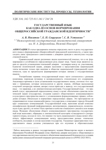 В статье предпринята попытка определить место и роль государственного языка в формировании общероссийской гражданской идентичности, а также проследить связь гражданского самосознания с доверием граждан к институтам государственной власти. Сравнительный анализ различных видов идентичностей показал, что в их формировании и устойчивости определяющую роль играет язык. Также язык является одним из средств установления отношений доверия - недоверия между их участниками. Единство политической нации, доверие населения к представителям национальной элиты возможно только при наличии в обществе национальной (гражданской) идентичности, одна из предпосылок формирования которых связана с государственным языком. Употребление термина «государственный язык» часто соотносится с разными понятиями, порождая путаницу и неопределенность относительно его содержания. Анализируя причины и цели установления государственного языка, соотнося этот термин с терминами, которые используются в других языках, обобщая высказанные в научной литературе мнения, авторы статьи приходят к выводу, что государственный язык - это правовая, а не лингвистическая категория. Государственный язык - это правовой статус, придаваемый определенному языку в целях обеспечения единства политической нации (государства), создания единого общественного коммуникативного и культурного пространства вместе с установлением формализованных правил, соблюдение которых обязательно в нормативно определенных сферах. Это пространство не ограничивается только взаимодействием с государством, а охватывает гораздо бóльший круг социальных коммуникаций. Государственный язык, выполняя целый комплекс специфических функций (информативную, интегративную, управленческую, политическую и ряд других), не может быть признан в качестве социального диалекта или жанра языка. Функции обеспечения общего коммуникативного пространства государственный язык выполняет, обращаясь к лингвистической категории «стандартного» (литературного) языка, исходя из того, что именно эта часть национального языка может обеспечить эффективную коммуникацию между представителями разных этнических сообществ, входящих в состав населения государства. Указанные характеристики государственного языка должны учитываться при его изучении в образовательных учреждениях, и в первую очередь в средних школах. Образовательные стандарты, программы и другие нормативно-методические документы должны учитывать необходимость освоения правил функционирования государственного языка, что в настоящее время обеспечивается не в полной мере.