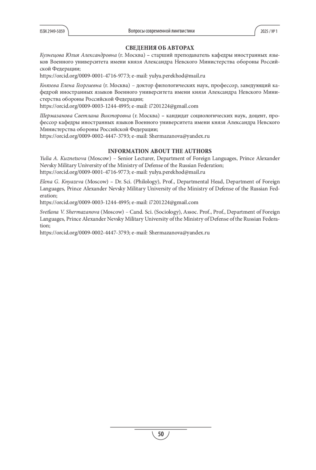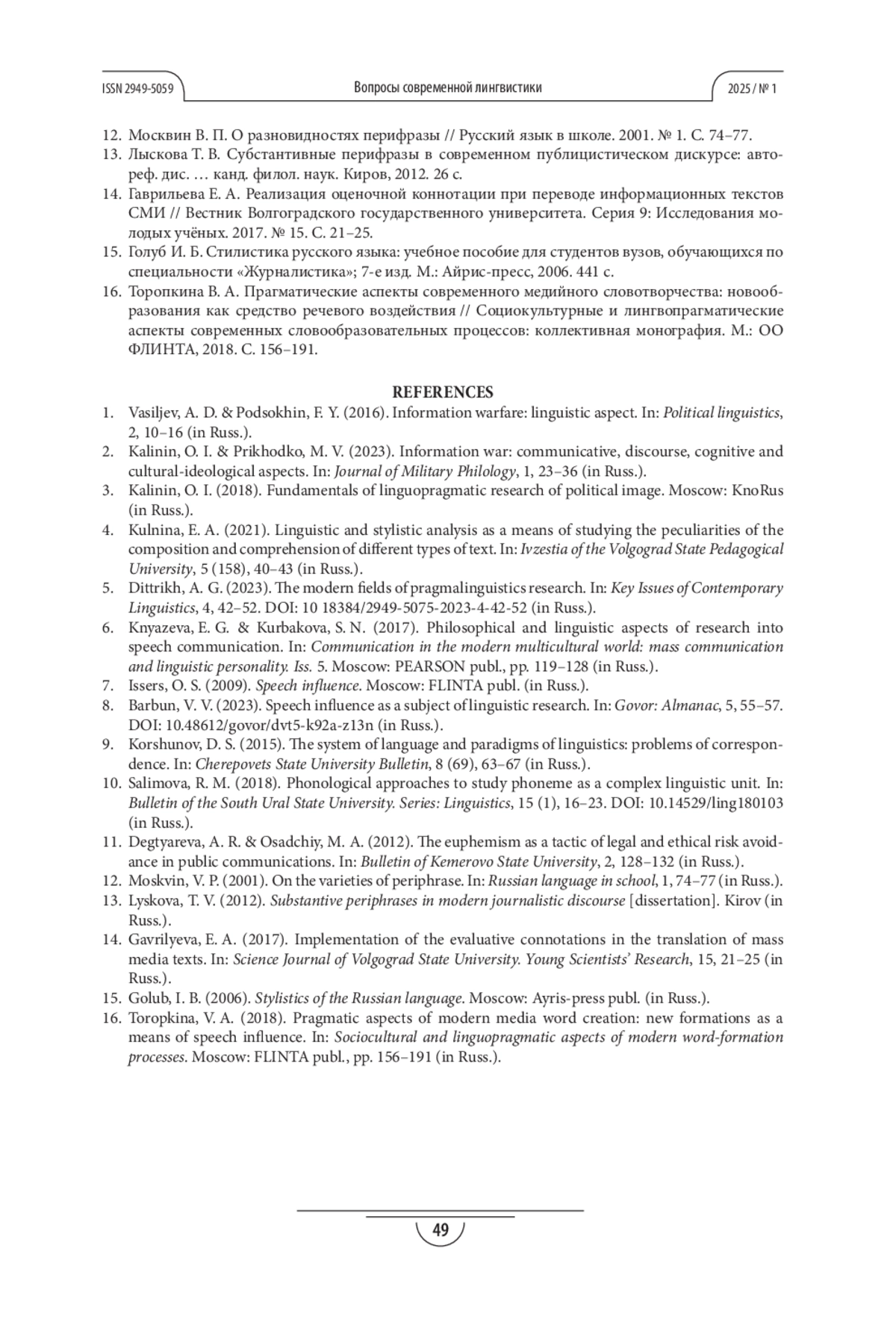 1. Васильев А. Д., Подсохин Ф. Е. Информационная война: лингвистический аспект // Политическая лингвистика. 2016. № 2. С. 10-16. EDN: WDNOUH