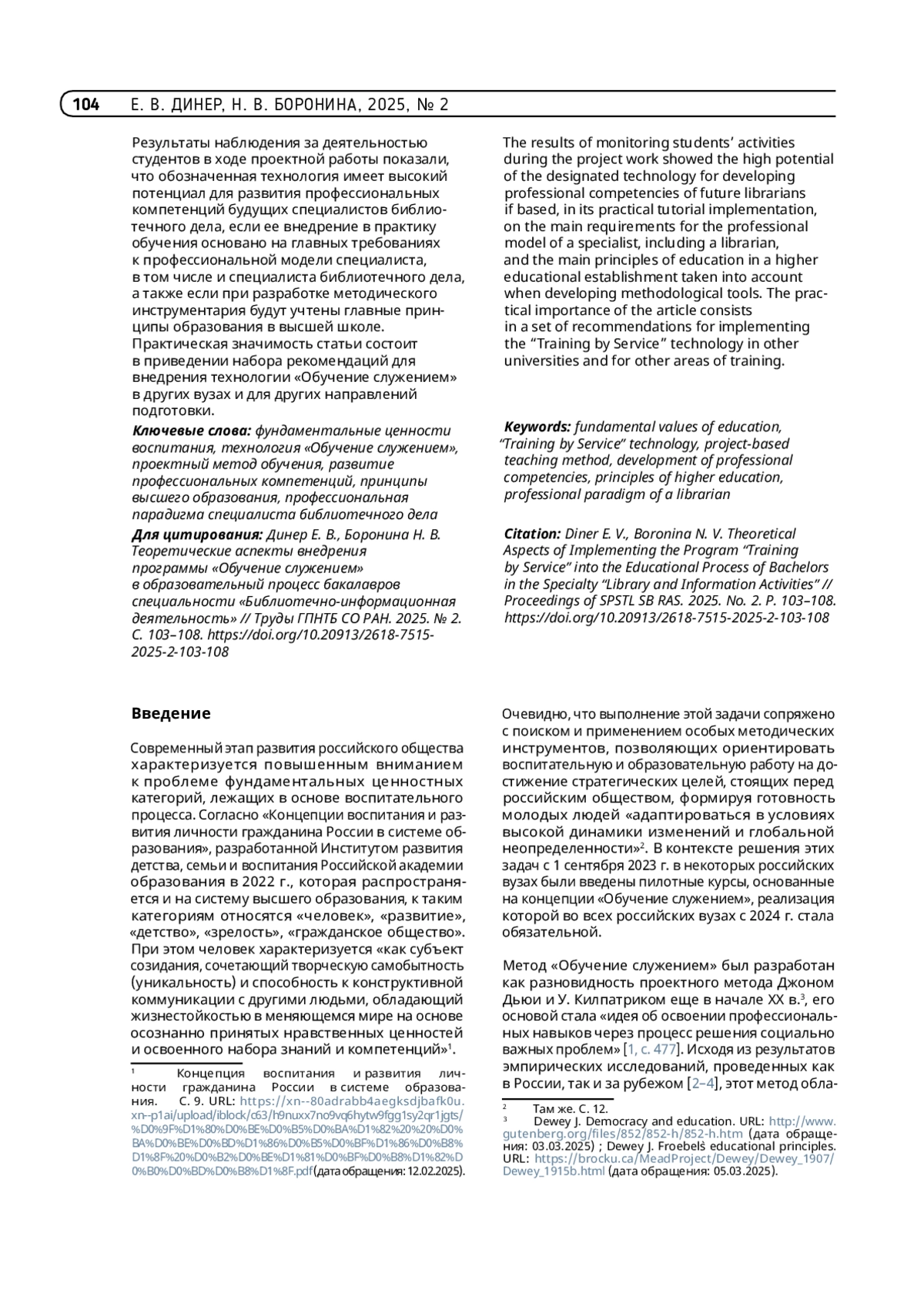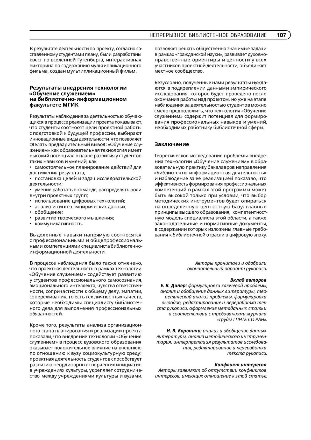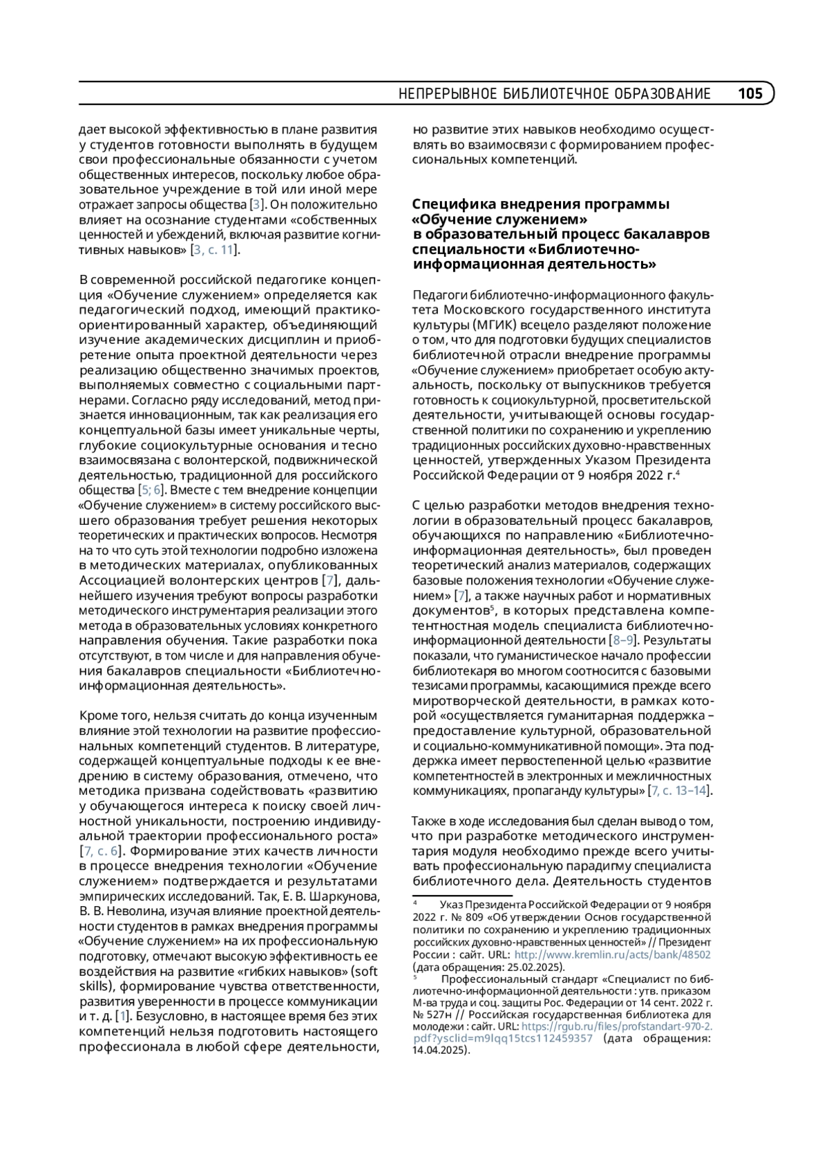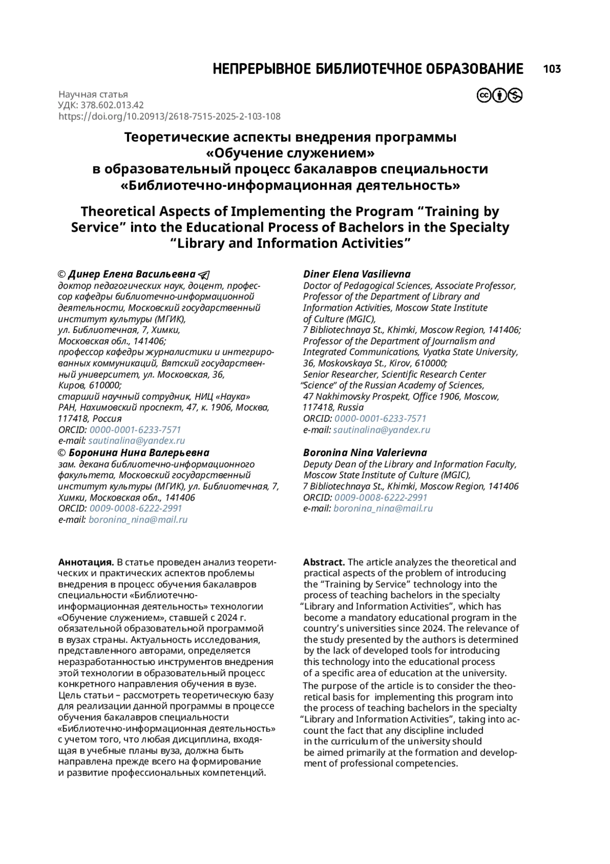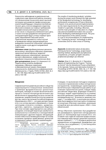 В статье проведен анализ теоретических и практических аспектов проблемы внедрения в процесс обучения бакалавров специальности «Библиотечноинформационная деятельность» технологии «Обучение служением», ставшей с 2024 г. обязательной образовательной программой в вузах страны. Актуальность исследования, представленного авторами, определяется неразработанностью инструментов внедрения этой технологии в образовательный процесс конкретного направления обучения в вузе.