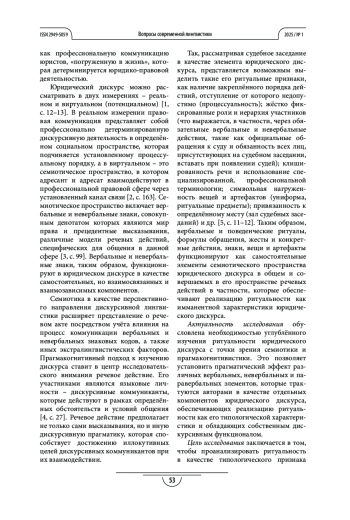 Процедуры и методы. Системность исследования семиотических характеристик юридического дискурса достигается за счёт использования методов дискурсивного, контекстуального, интерпретативного, когнитивного и структурно-семантического анализа. Интегральный методический подход, опирающийся на семиотику, когнитивистику и теорию дискурса, гарантирует корректность исследования вербальных, невербальных, иконических и артефактуальных компонентов юридического дискурса, обеспечивающих ритуальность как его типологическую характеристику.
