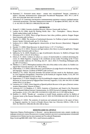 17. Галяшина Е. И. Семиотика эмотиконов и анимационных картинок в аспекте судебной лингвистической экспертизы // Вестник Университета имени О. Е. Кутафина (МГЮА). 2022. № 2 (90). С. 41-48. DOI: 10.17803/2311-5998.2022.90.2.041-048 EDN: PCFFYR