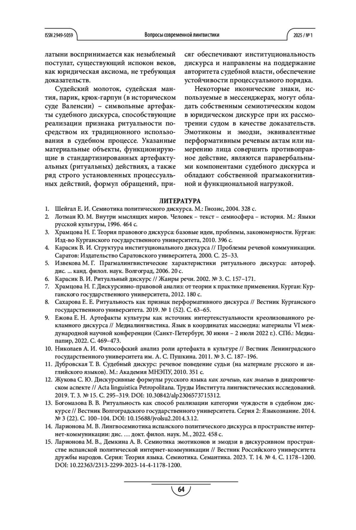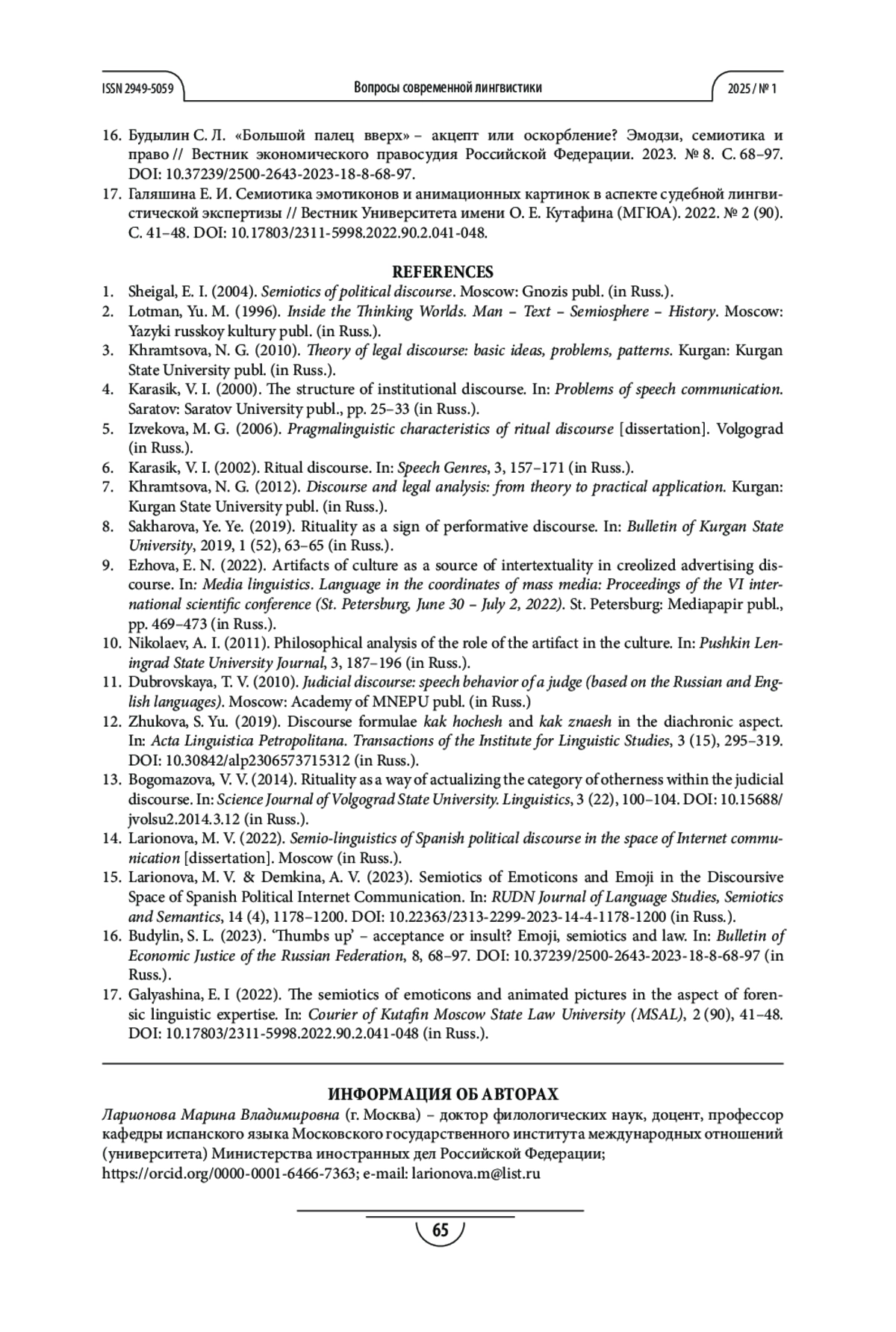 15. Ларионова М. В., Демкина А. В. Семиотика эмотиконов и эмодзи в дискурсивном пространстве испанской политической интернет-коммуникации // Вестник Российского университета дружбы народов. Серия: Теория языка. Семиотика. Семантика. 2023. Т. 14. № 4. С. 1178-1200. DOI: 10.22363/2313-2299-2023-14-4-1178-1200 EDN: CAUGSW